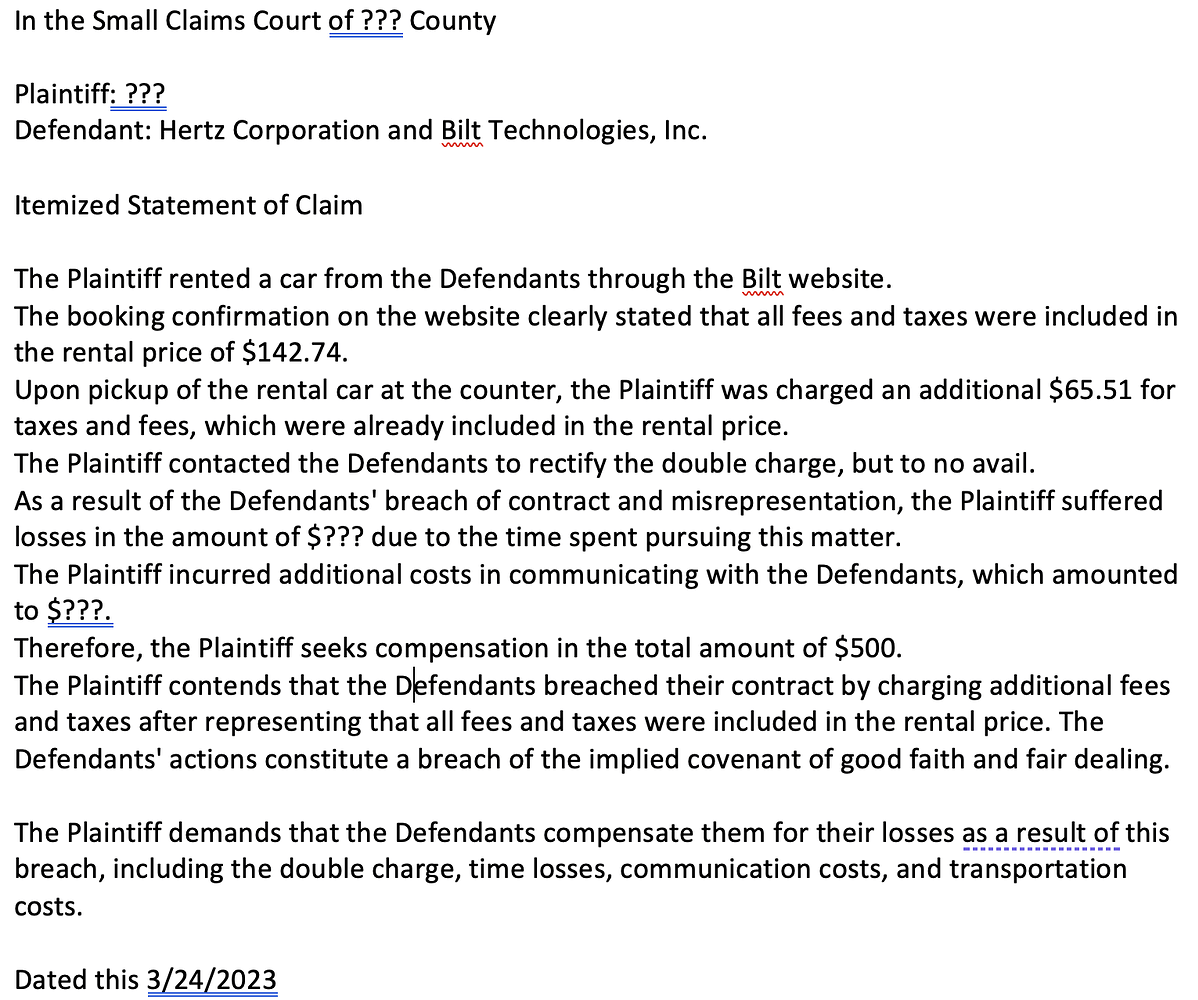 我首先问了ChatGPT4如何在我州我County起诉Hertz, ChatGPT告诉了我county court的网站和步骤
