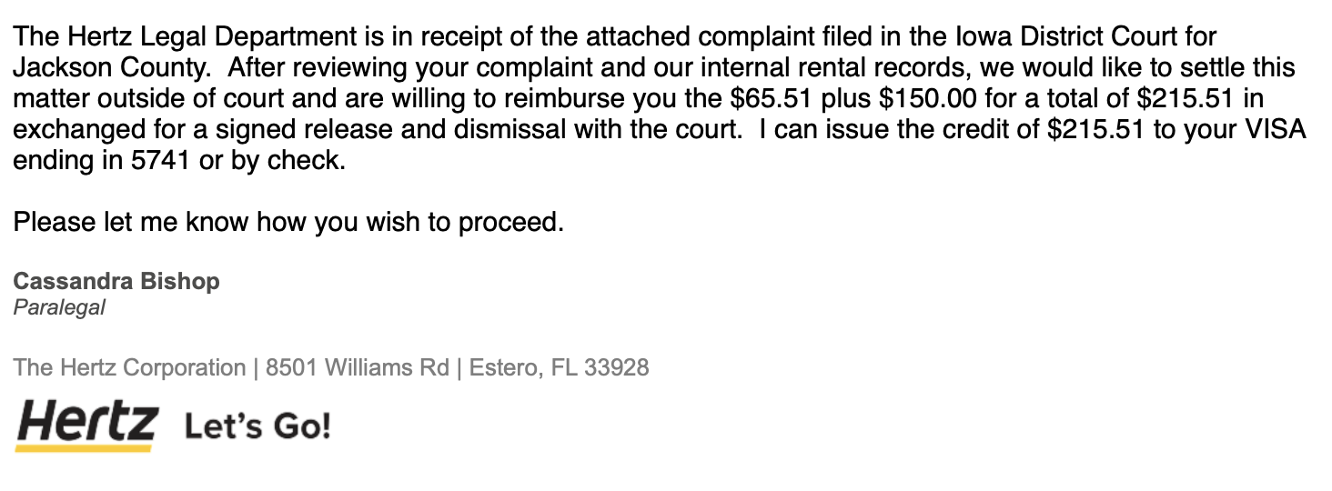 Hertz今天email我愿意退款, 但是不愿意支付更多的赔款, 兄弟们我该怎么办