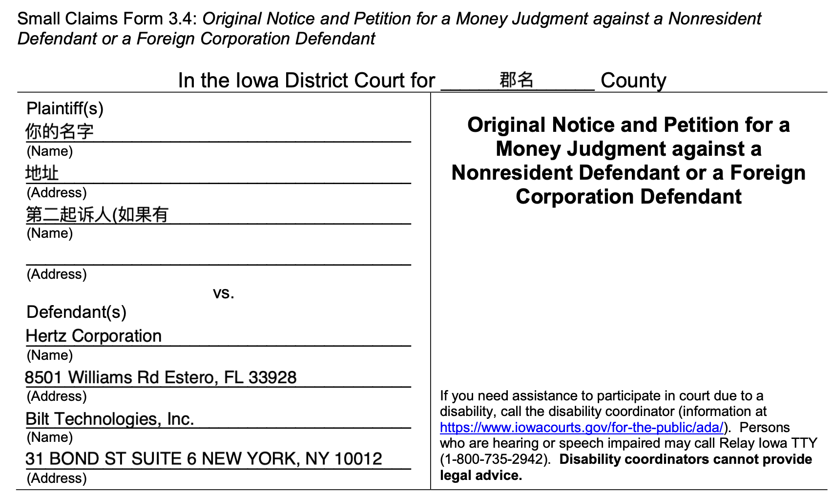 在Iowa起诉, 首先需要确定正确的Court Form (aka Original Notice) 这里面最大的区别在于被告如果是外州的话要填写的表格是不一样的. 以Iowa为例, 本州的Money Judgement填写3.1, 外州被告的话填写3.4, 如果是房产有关的需填写其他. 选form之前看好要求Court Forms | Iowa Judicial Branch