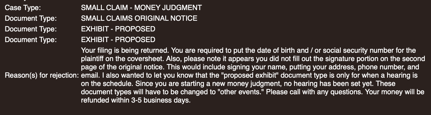我第一次递交被Return了, 大概就是因为个人信息页没有完整, 证据放错目录, 没有签名. 这点不用担心, 如果被return了钱可以退回来的. 而且法院的工作人员效率也会很耐心的和你解释. 我12:15递交的, 他们12:24就回复了我下面的这个邮件, 可以说是即刻review了