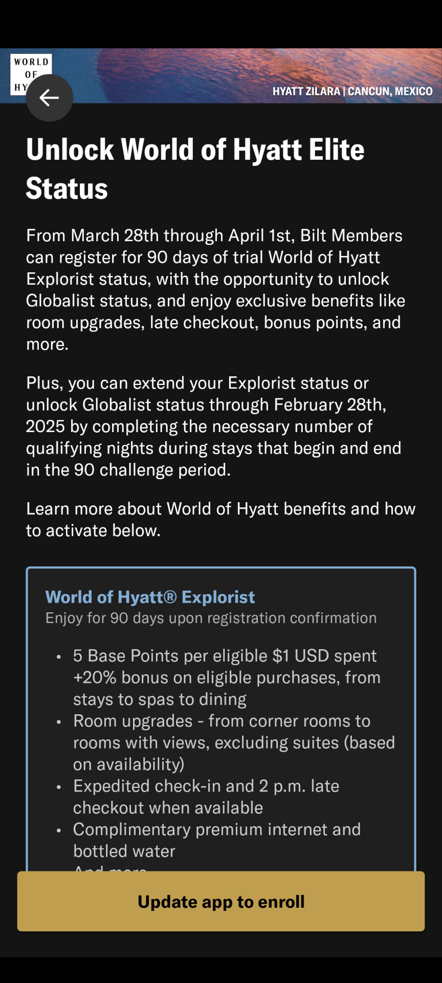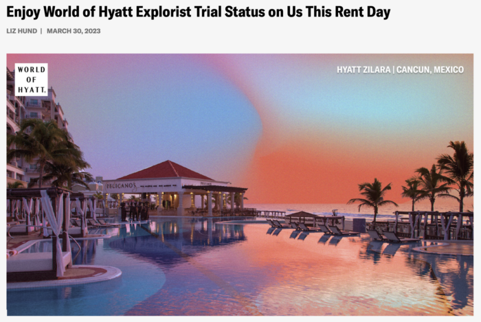 Upon registration, World of Hyatt members will receive a trial upgrade to Explorist status through July 16, 2023. The trial will provide the member with the benefits of Explorist status, as set forth in the World of Hyatt program terms, provided that the member will not receive any Explorist Club Lounge Access Awards (as defined in the World of Hyatt program terms) or be eligible to tier match into MGM Rewards, the loyalty program of MGM Resorts International, as part of the trial. To maintain Explorist status through February 2025, member must complete at least ten (10) Tier-Qualifying Nights (as defined in the World of Hyatt program terms) at any participating Hyatt hotels and resorts worldwide, participating MGM Rewards destinations, Small Luxury Hotels of the World (“SLH”) properties, or Lindblad Expeditions on stays started and completed during the Explorist Trial Period. If member completes at least twenty (20) Tier-Qualifying Nights at any participating Hyatt hotels and resorts worldwide, participating MGM Rewards destinations, SLH hotels, or Lindblad Expeditions on stays started and completed during Explorist Trial Period, member will receive Globalist status through February 2025. The offer will provide the member