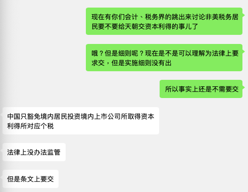 另外我觉得讨论这个价值不是太大,政策上没什么可以解读的,整个都很模糊。严格讲中国人不能主动投资美股,也不允许换钱去买美股,自然不会出台正式文件规定美股收益怎么征税。