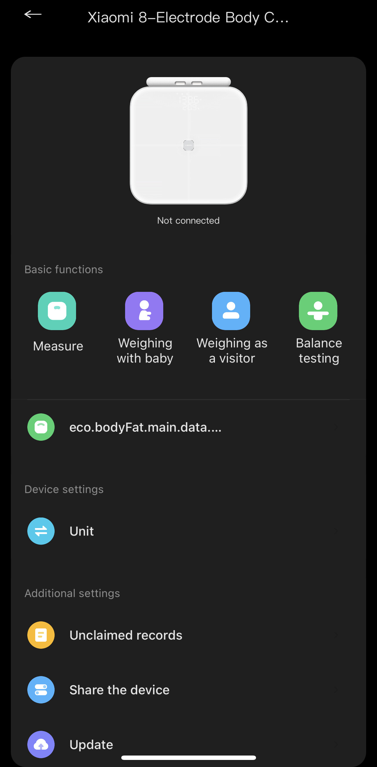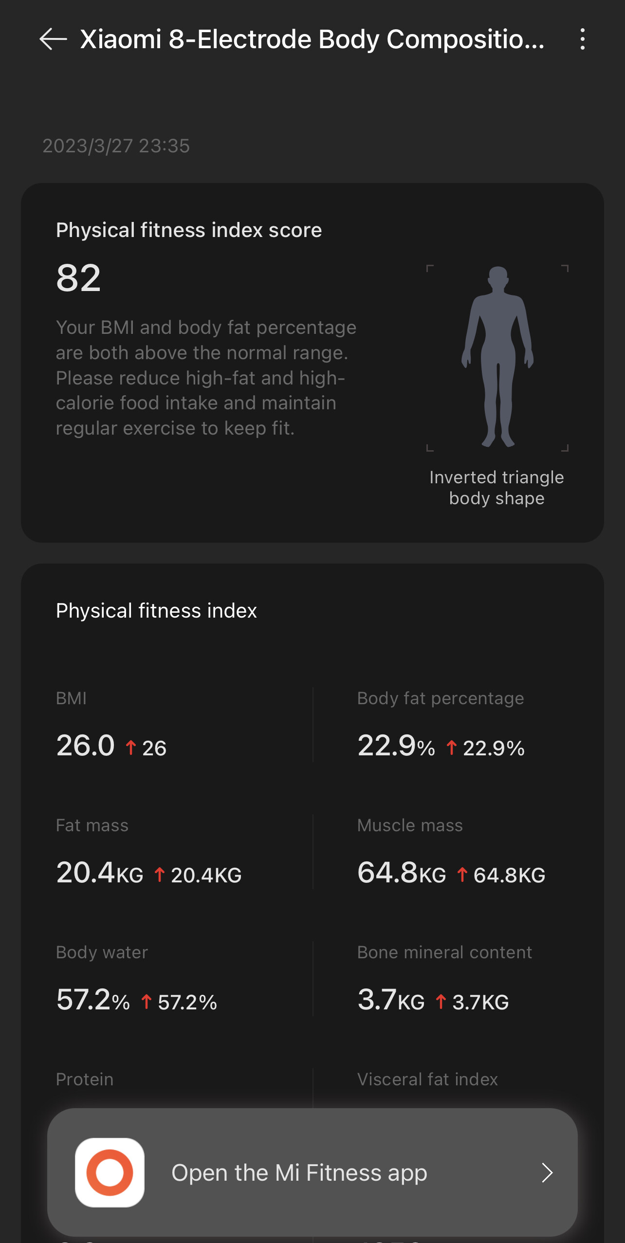 颜值真的很高,现在就直接摆在客厅,见了都夸好看。很好上手,测量需要下载小米运动app (美区即可,但是似乎得用国服的小米账号),之后可以在米家app里查看报告。测量的结果还是蛮准的,可以看到身体各个部位哪里脂肪含量过高,哪里需要增肌。(非常残忍会伤了肥宅的心)