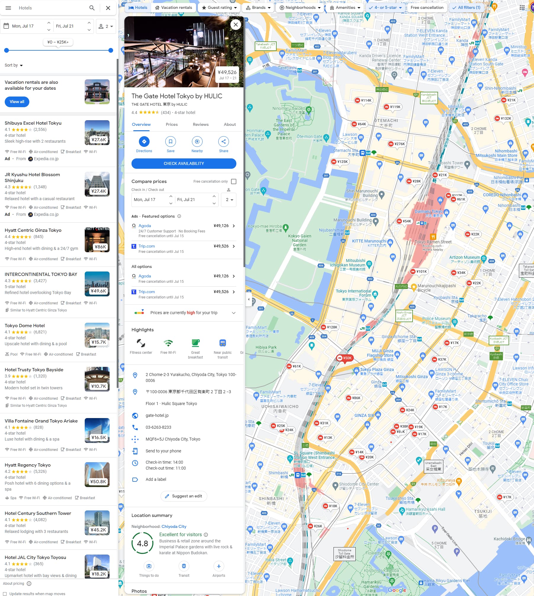 只要在地图里搜索hotels,就会出现这个界面,响应极其灵敏,可以方便快速的找到想去的地方附近的酒店,点开酒店就可以各个平台比价,酒店和agent的覆盖率极高,比booking agoda之类小厂做的东西好用多了。