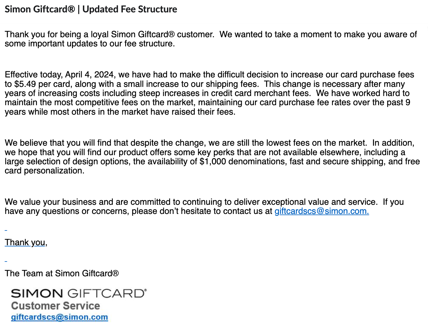 Simon VGC online purchase fee 全面涨价,请看下面的邮件: