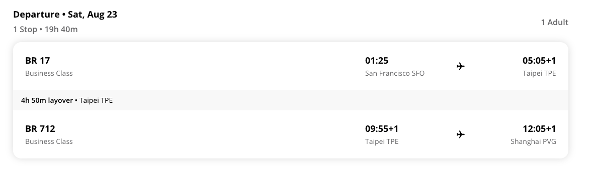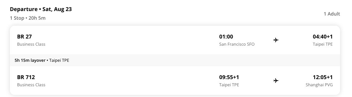 退3张8.23周六凌晨,SFO飞TPE的(可接上海/澳门), BR 17, BR 27, JX 11