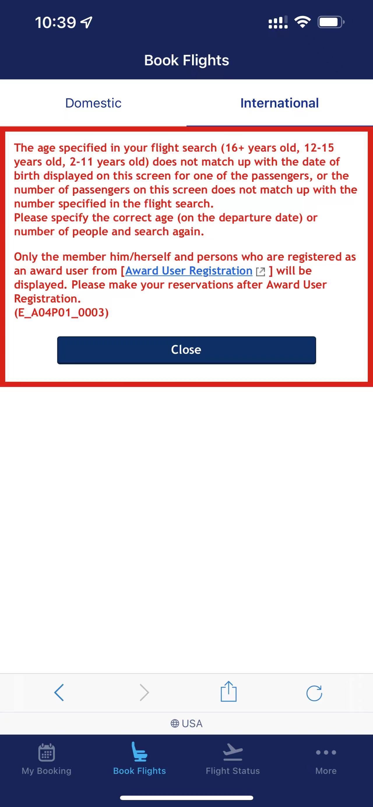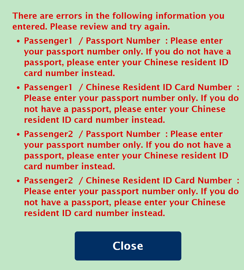5月准备回国玩玩,准备用ANA出吉祥航空(上海到昆明),在选择passenger这一步,输入了护照号和身份证号,但似乎总是出现以下错误提示,有大佬知道如何解决吗?