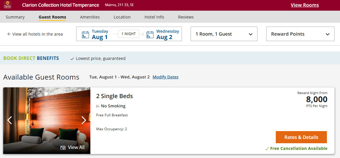 是的,很不错,而且通勤大法适用。不过顺便提醒一下,Malmo还有个8,000 Choice积分每晚的Clarion Collections Hotel,包早晚餐。所以看你想优先烧Choice还是Hyatt点数吧。