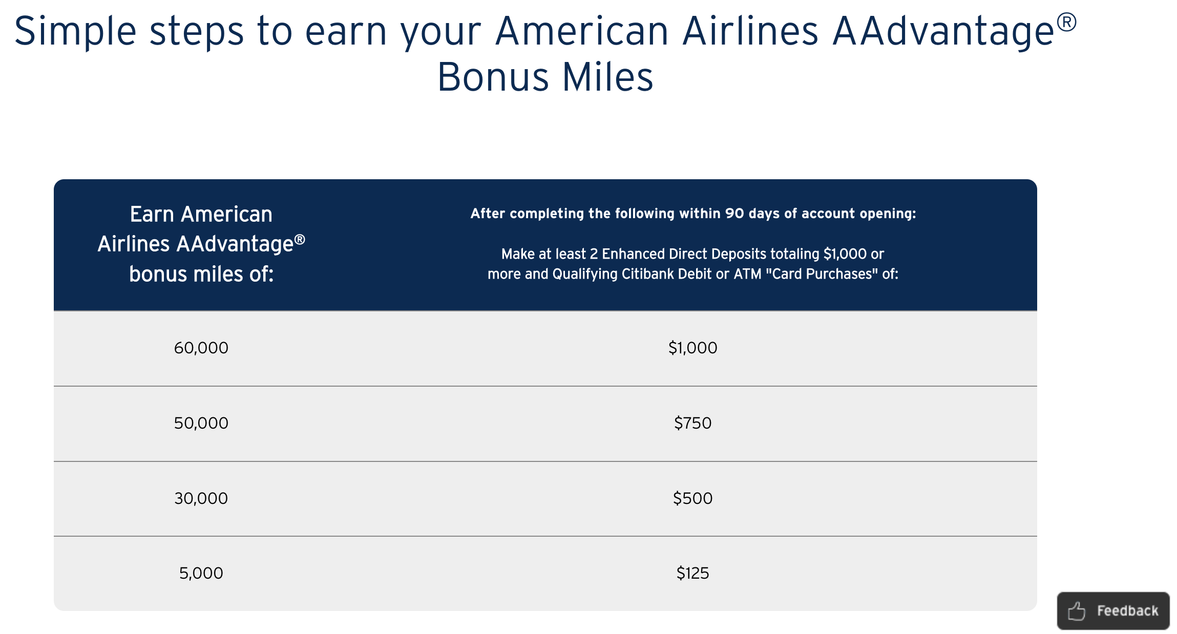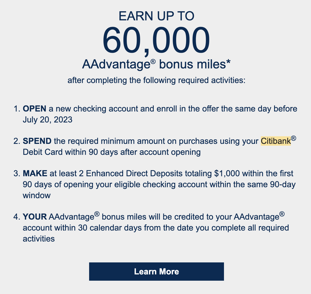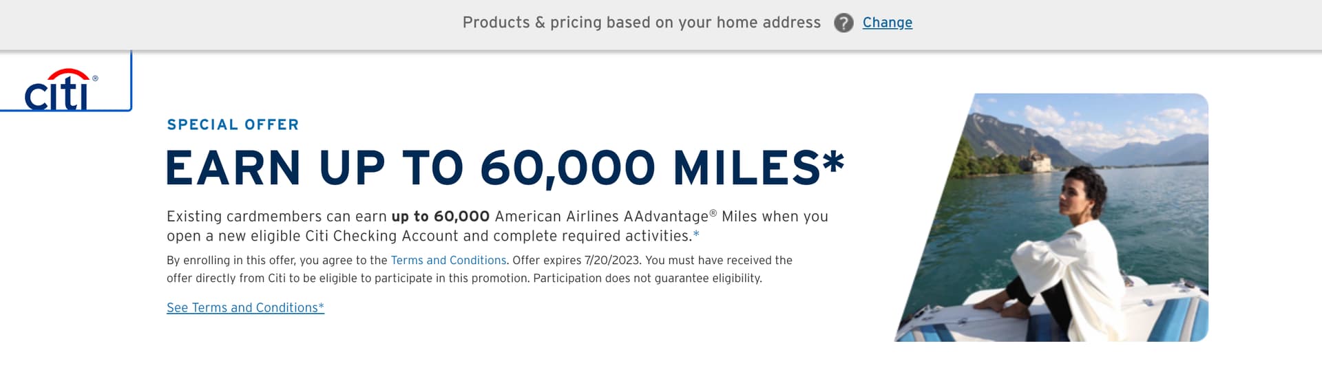 Although no one can participate in a checking acquisition offer if they already own a checking account at Citibank, some checking acquisition offers allow customers to participate if they closed their Checking Accounts more than 180 days ago. The Member American Airlines AAdvantage® Miles Checking Offer, however, requires customer not own a checking account at Citibank for at least 18 months.
