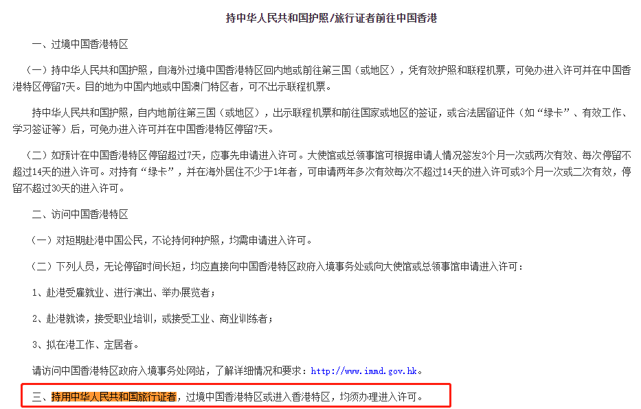 “持用中华人民共和国旅行证者,过境中国香港特区或进入香港特区,均须办理进入许可。"