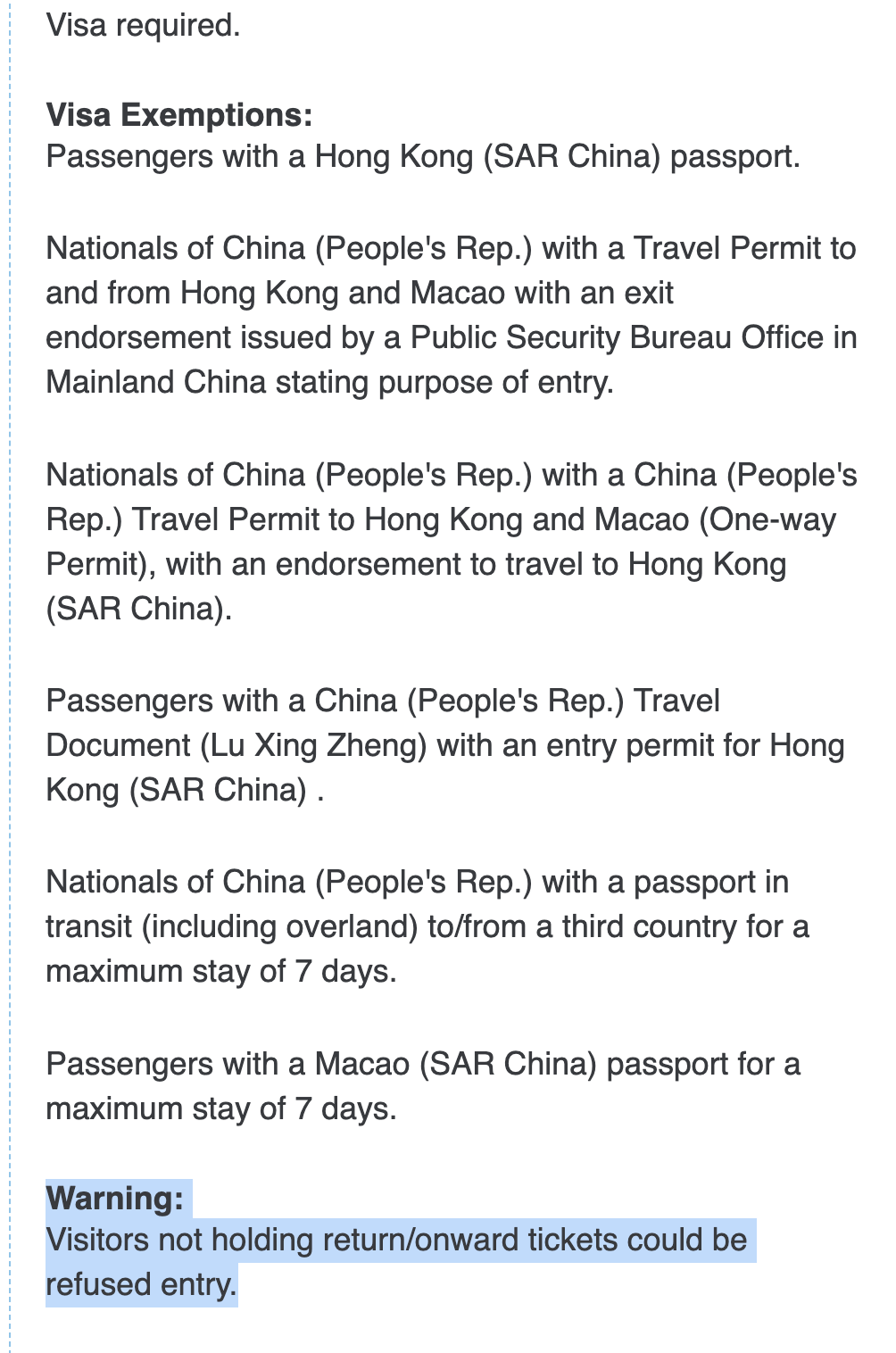Visa exemption英文条款里有没有写,如果目的地是中国大陆或澳门,可以不出示机票或行程预定?