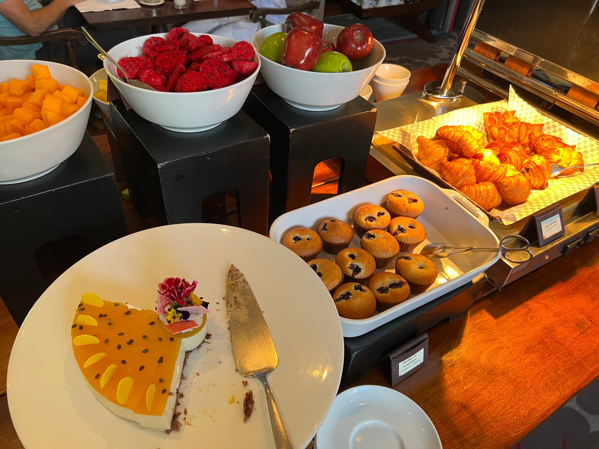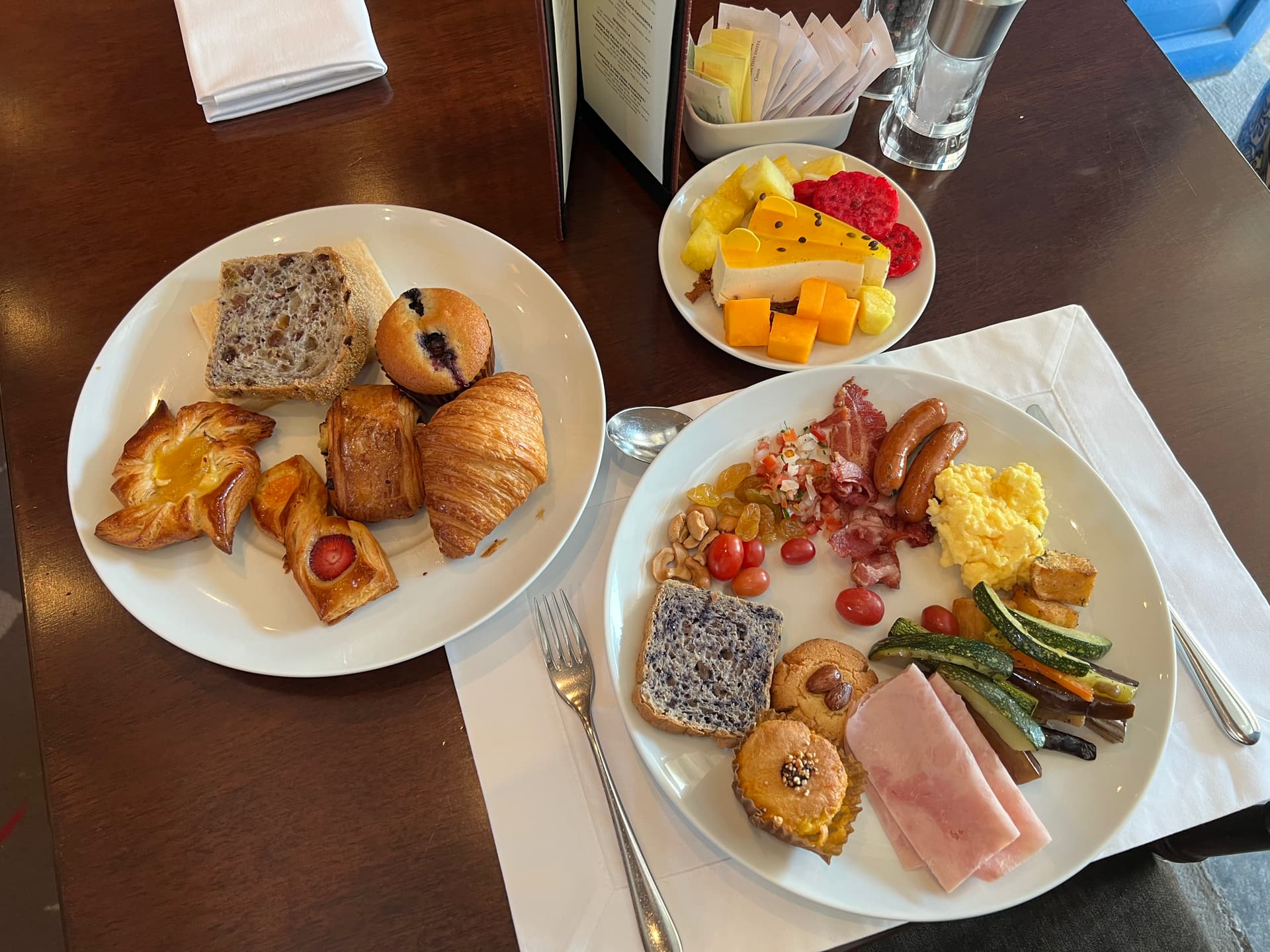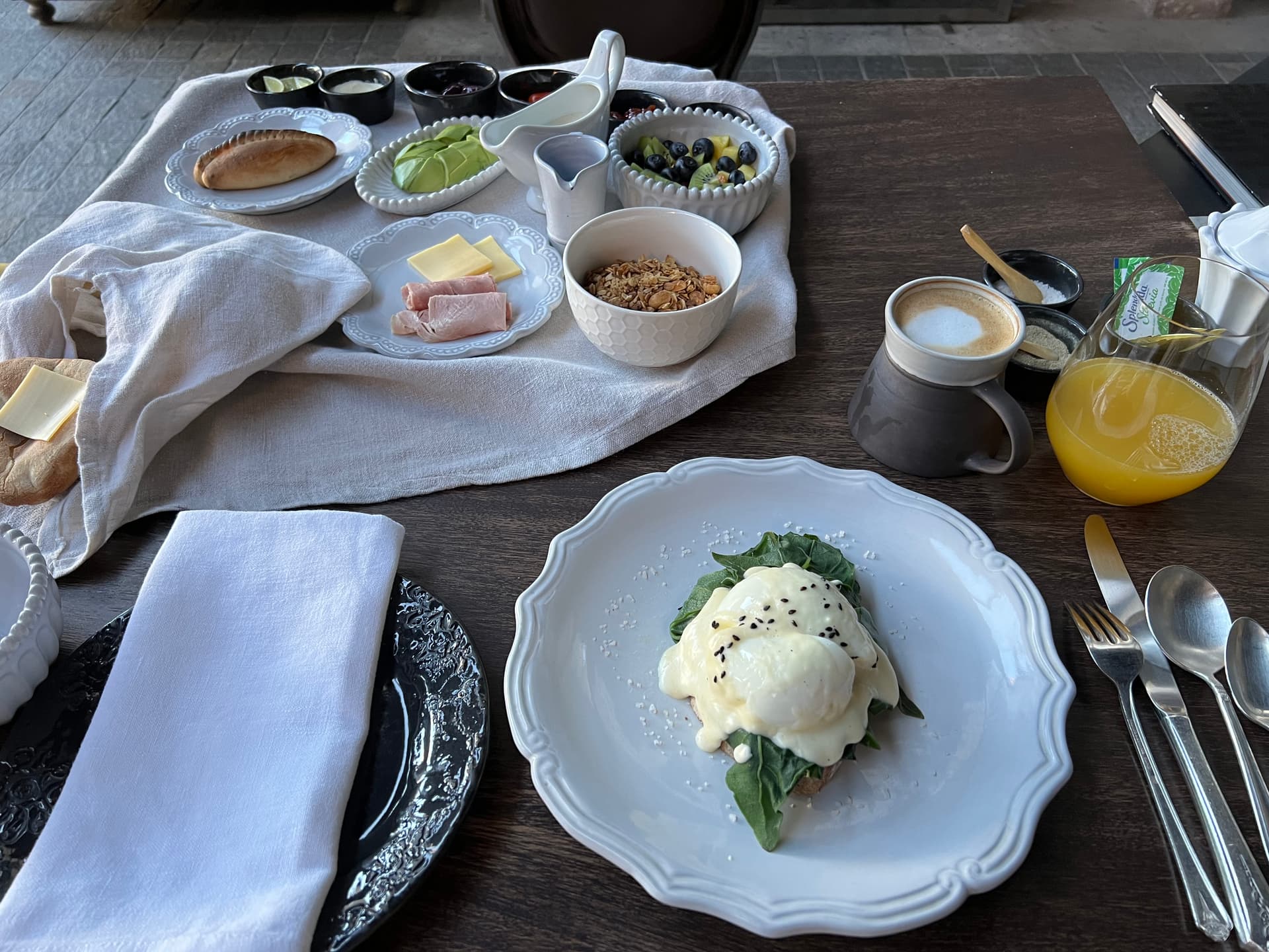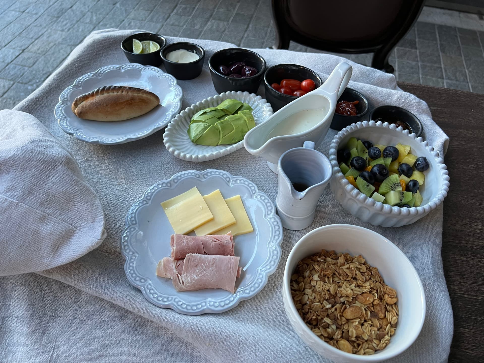 )早上7点就洗漱好冲去餐厅吃早饭,早餐是breakfast tray+五种main course选其一,基本上就是鸡蛋的不同做法和不同配菜,最后本人鉴于breakfast tray里已经包含了一整碟牛油果就改要了eggs florentine and spinach,breakfast tray包括三个秘鲁干面包、一碟牛油果、若干腌渍的果子、一碗新鲜水果、火腿片、谷物和一个内里填充了某种肉酱的面包,整体来说就是正常品质,毕竟目前看来没有酒店的早餐可以超越坎昆华尔道夫