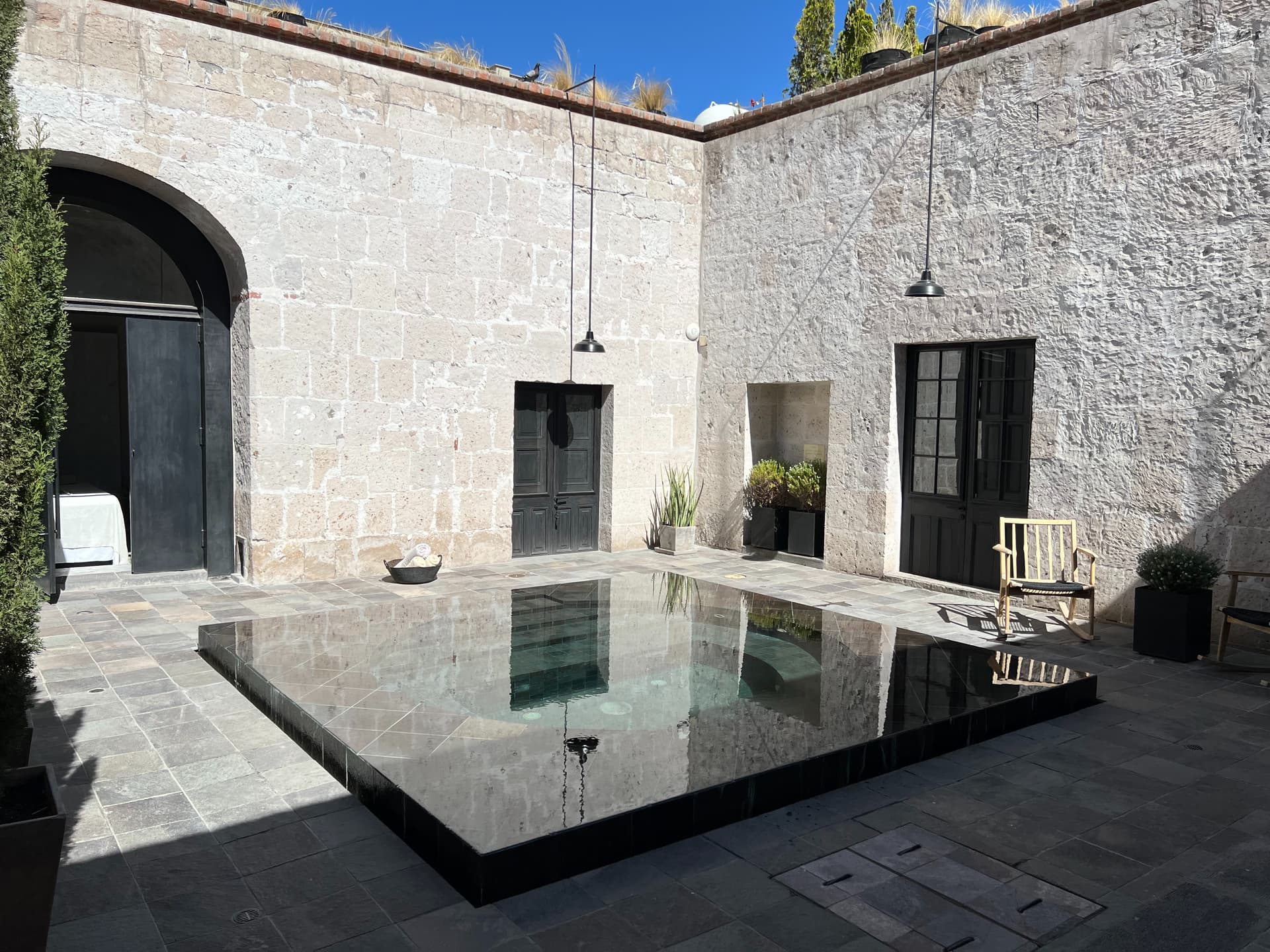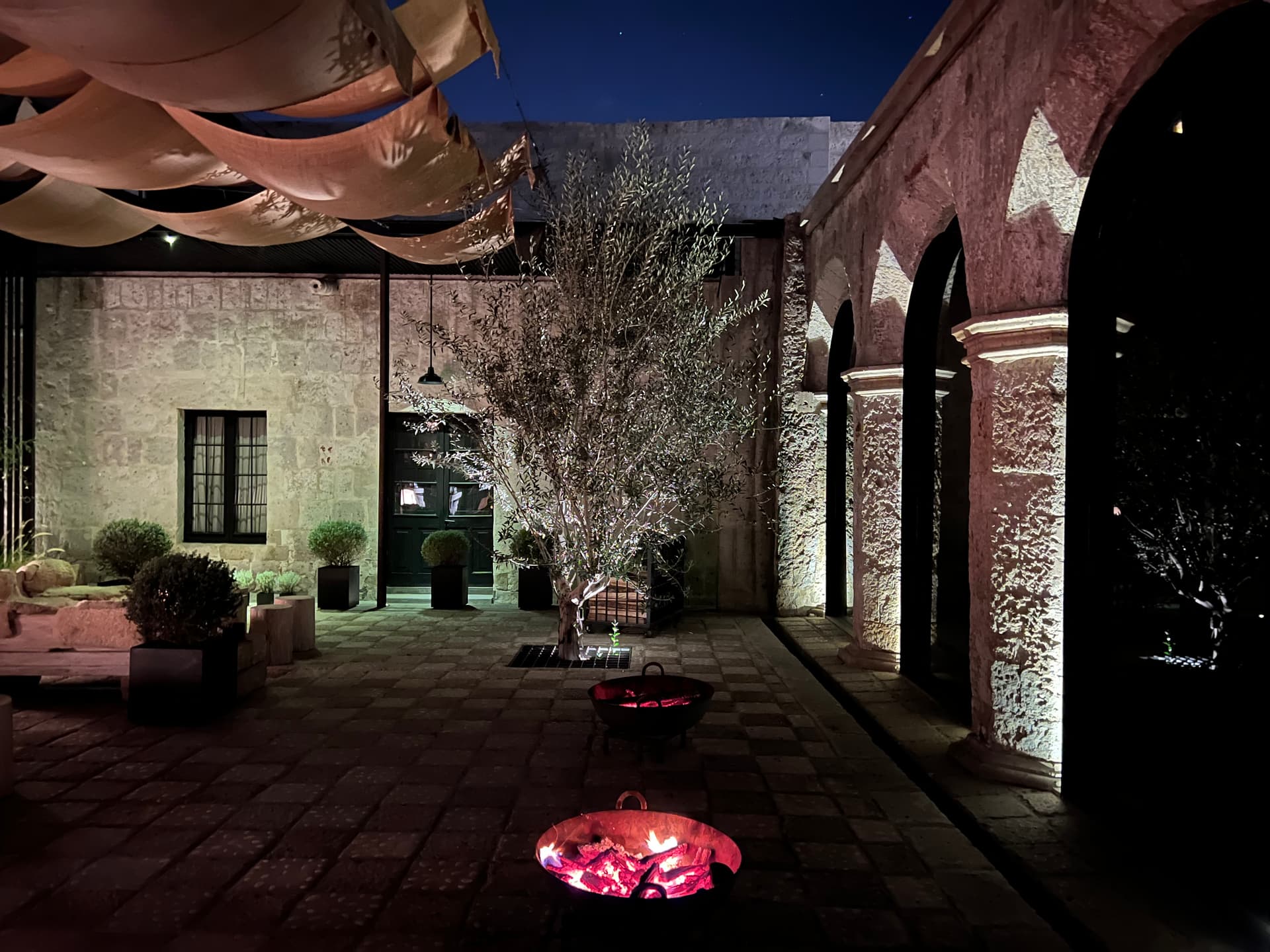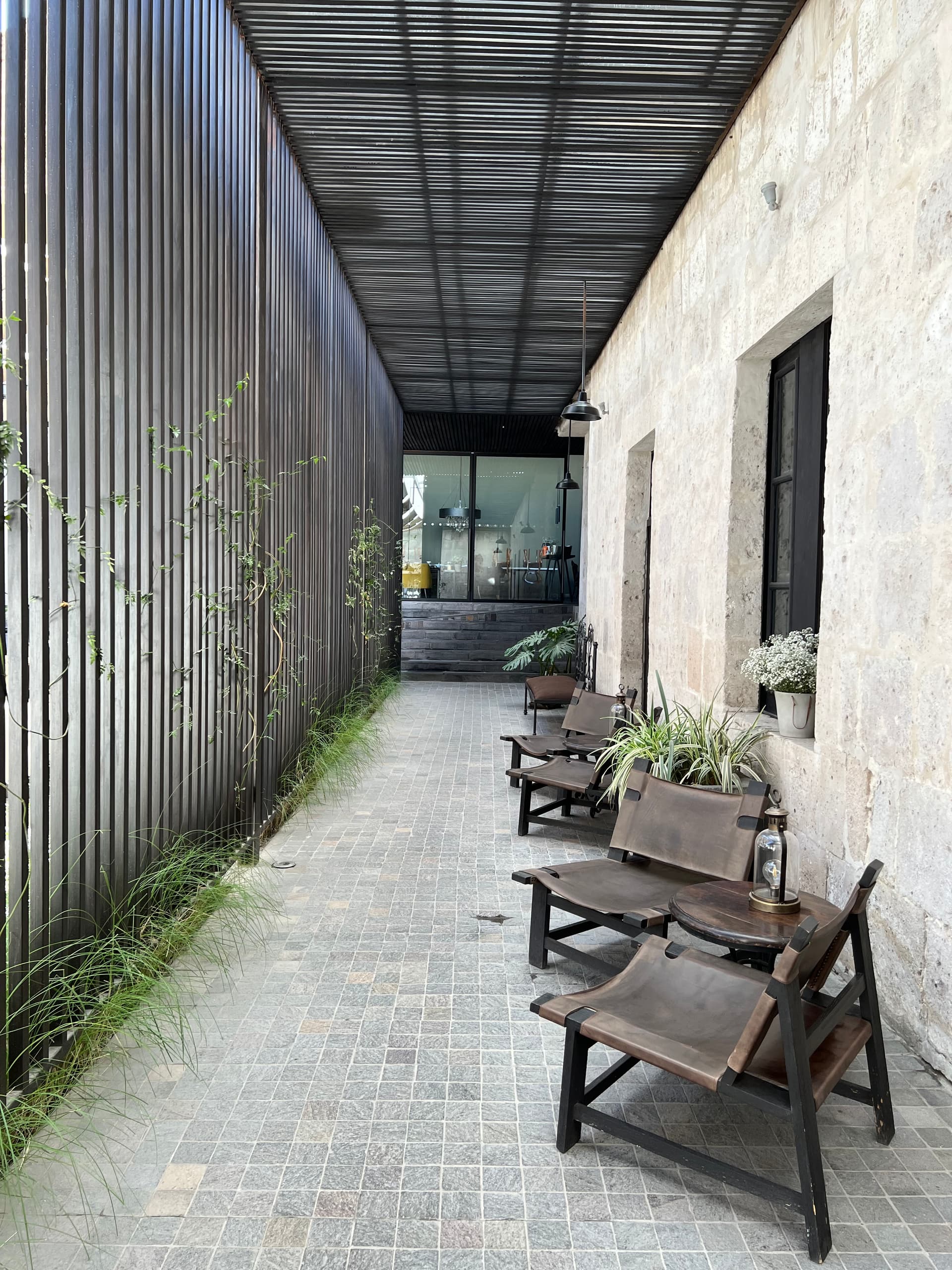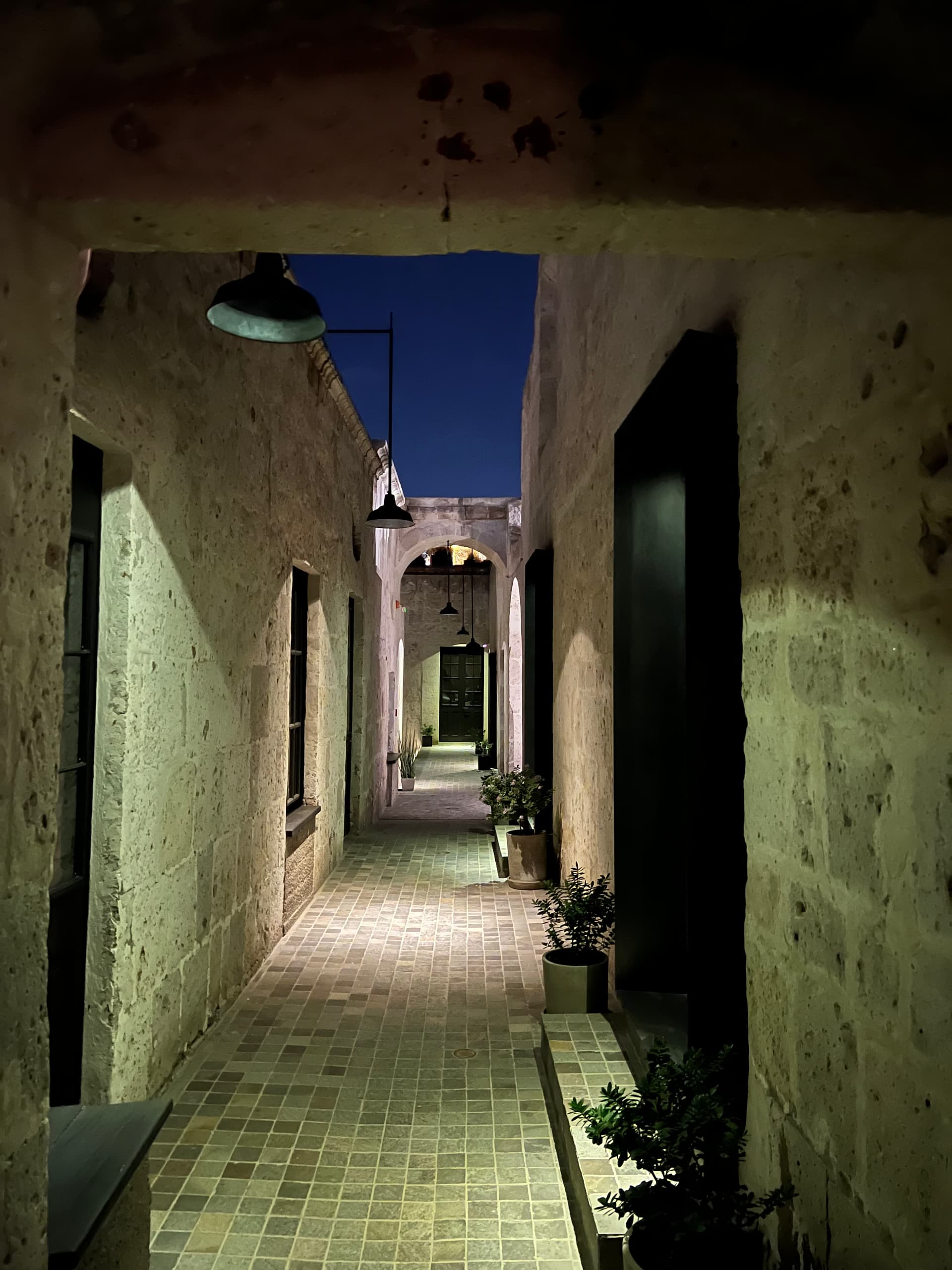 下午4点退房晚上8点顺利抵达阿雷基帕的Cirqa,酒店外观非常低调不起眼,用当地白色石头建造的一层建筑,黑色的雕花铁门紧锁,也没有什么招牌或者显眼的罗莱夏朵图标,我来回找了一会才确定门牌号没错并在门边上发现了一个门铃