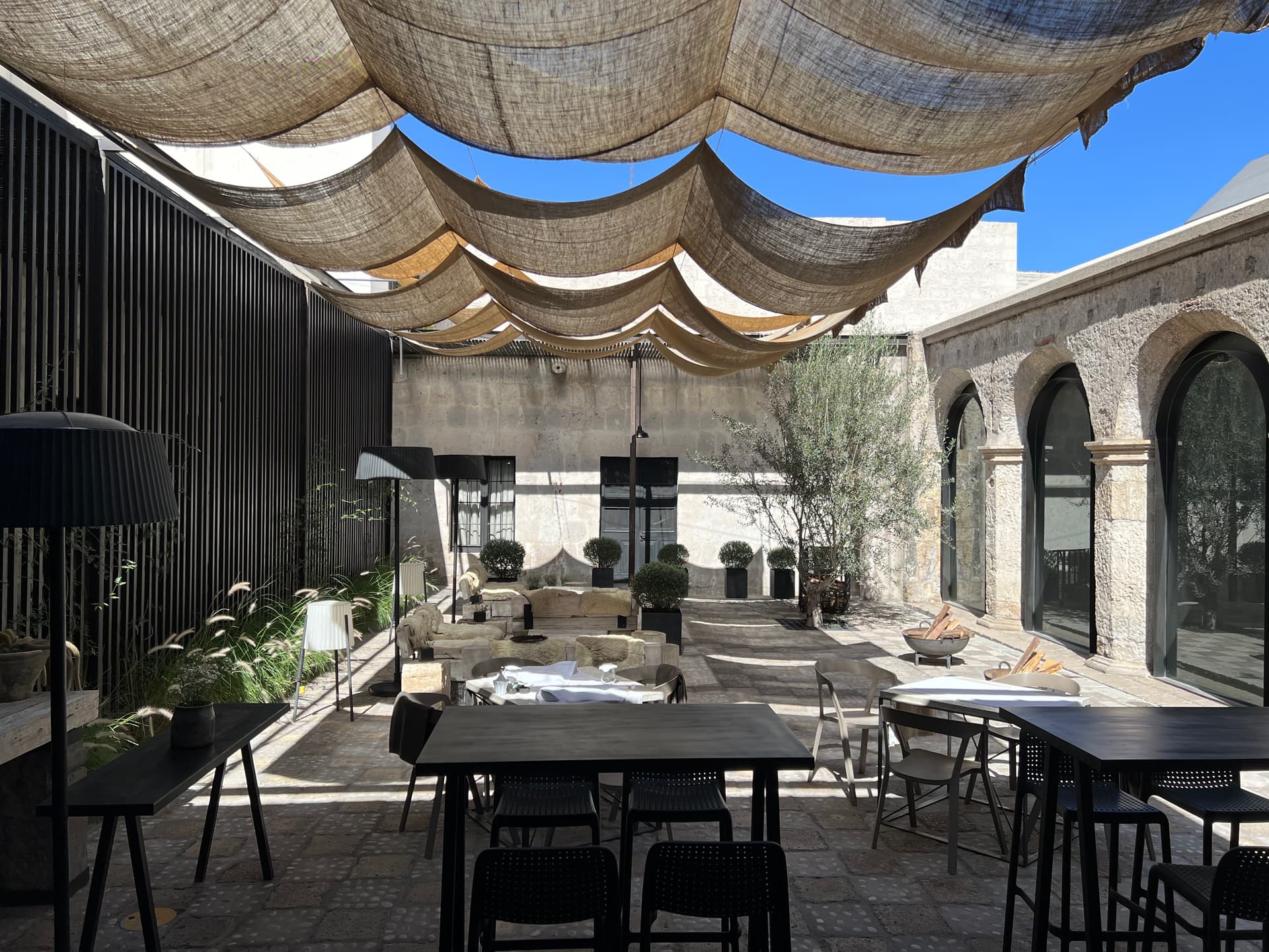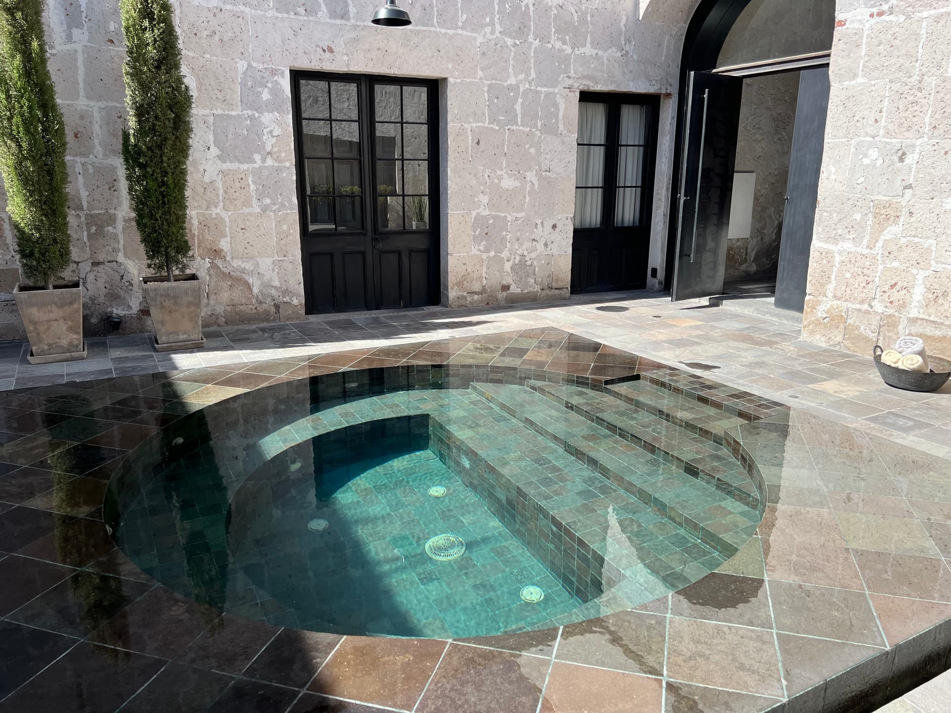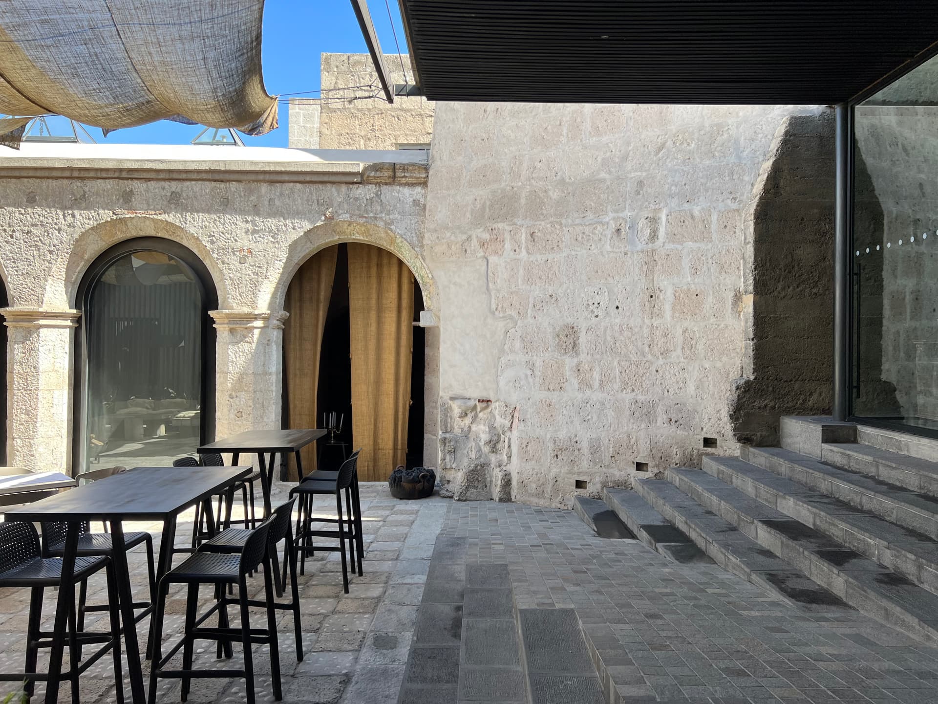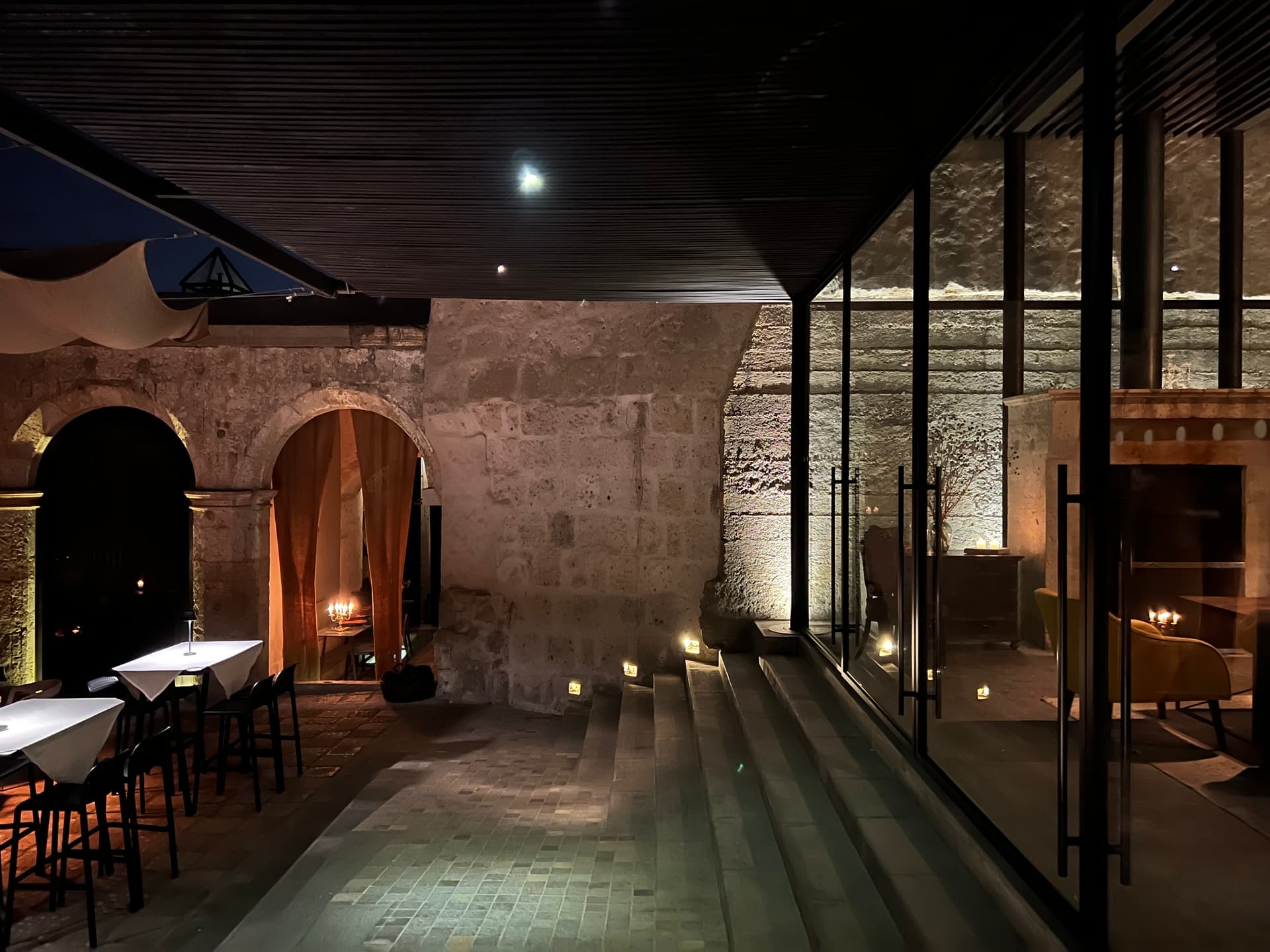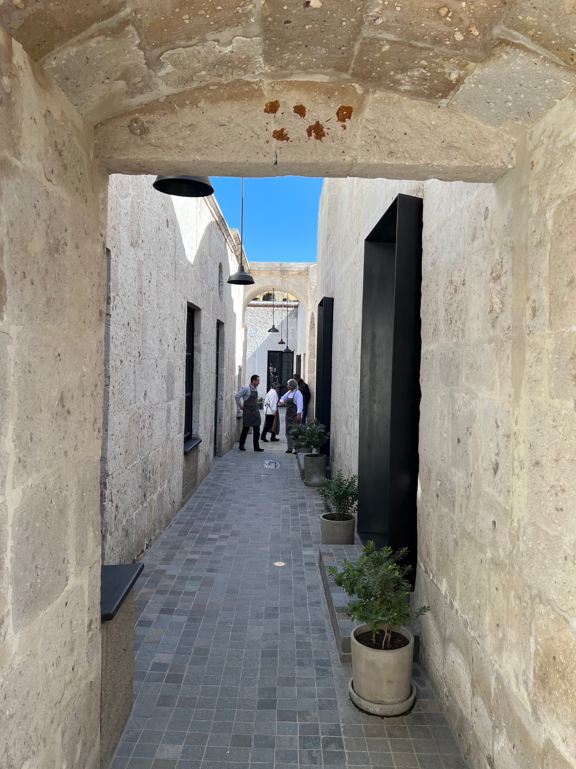 下午4点退房晚上8点顺利抵达阿雷基帕的Cirqa,酒店外观非常低调不起眼,用当地白色石头建造的一层建筑,黑色的雕花铁门紧锁,也没有什么招牌或者显眼的罗莱夏朵图标,我来回找了一会才确定门牌号没错并在门边上发现了一个门铃