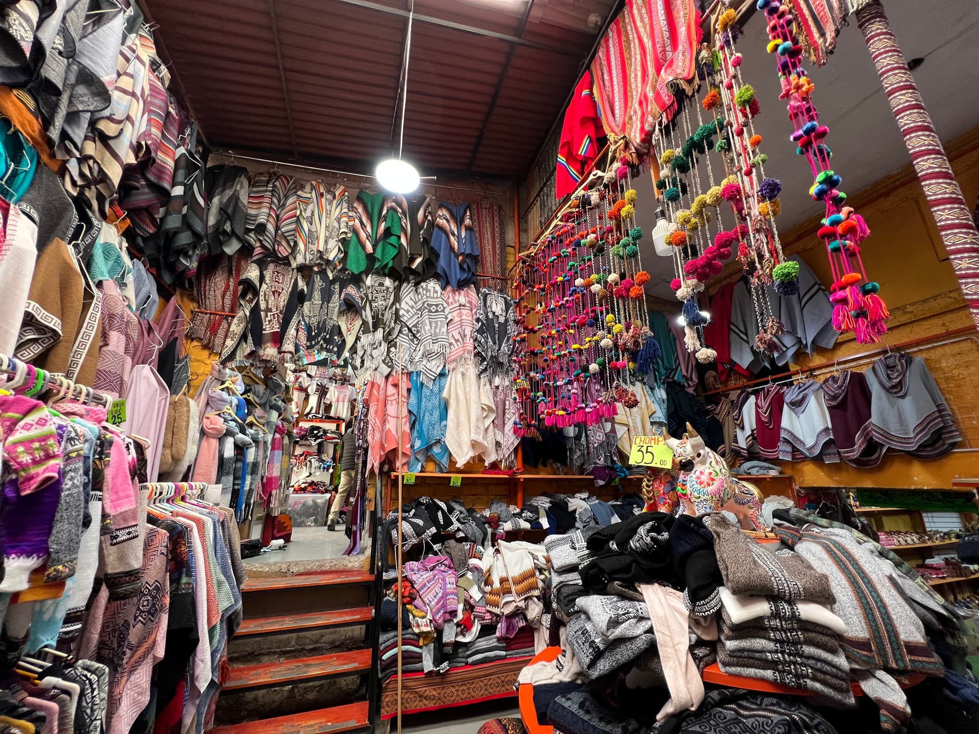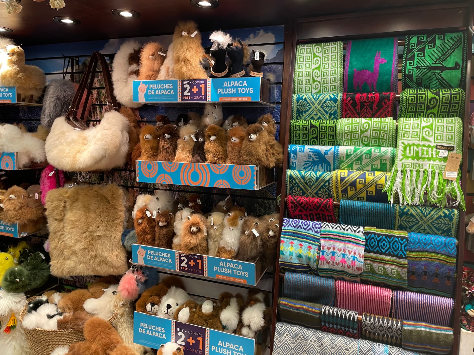 库斯科地区海拔3400米,虽然没什么高原反应,但是时值南半球秋冬天,早晨和晚上还是挺冷的,于是顺路先找了家特产店买了件保暖又好看的斗篷(不是羊驼毛制品,羊驼毛制品还挺贵的,一件毛衣都要四五百soles,普通毛衣只要三四十soles也很好看)