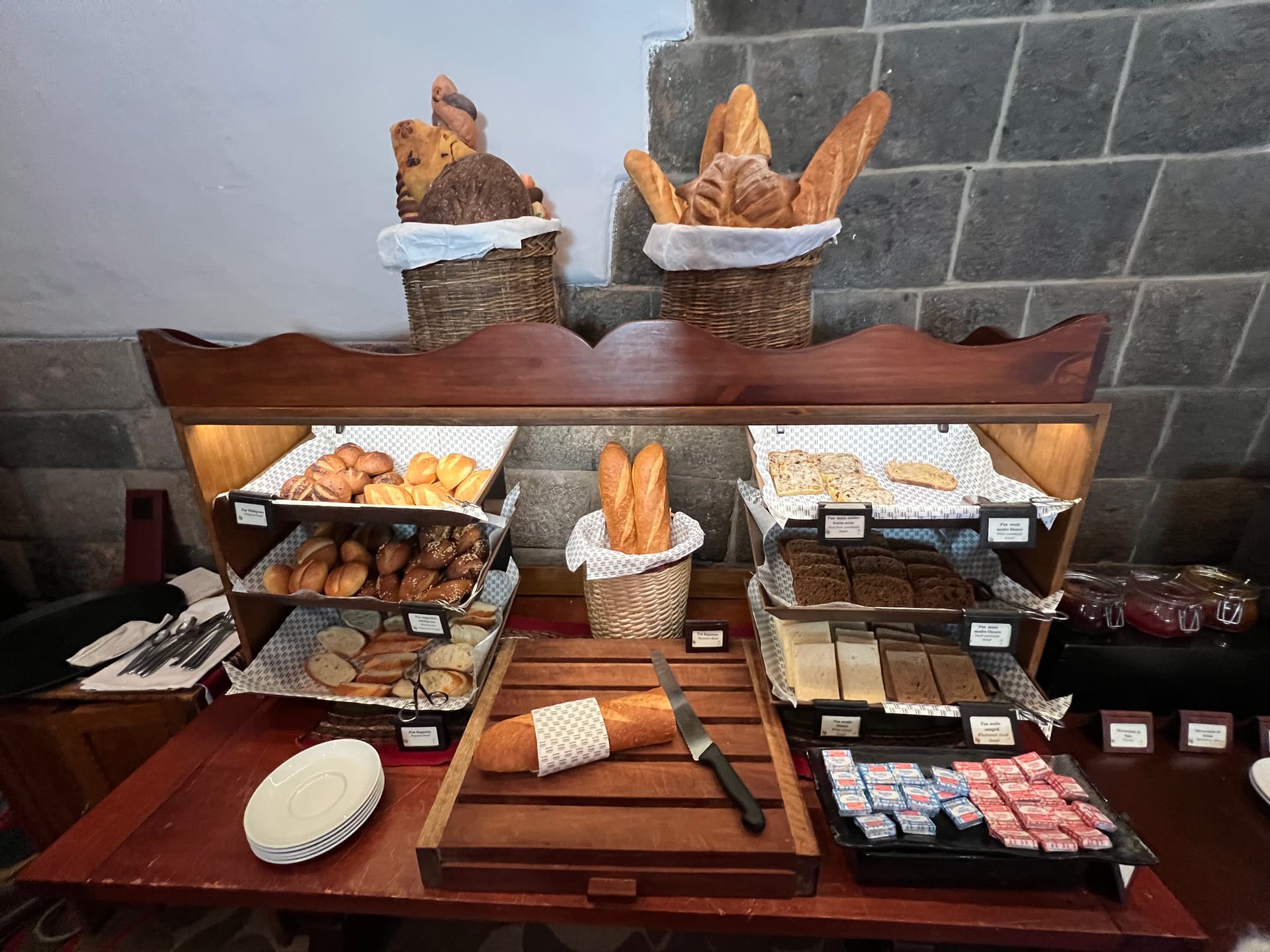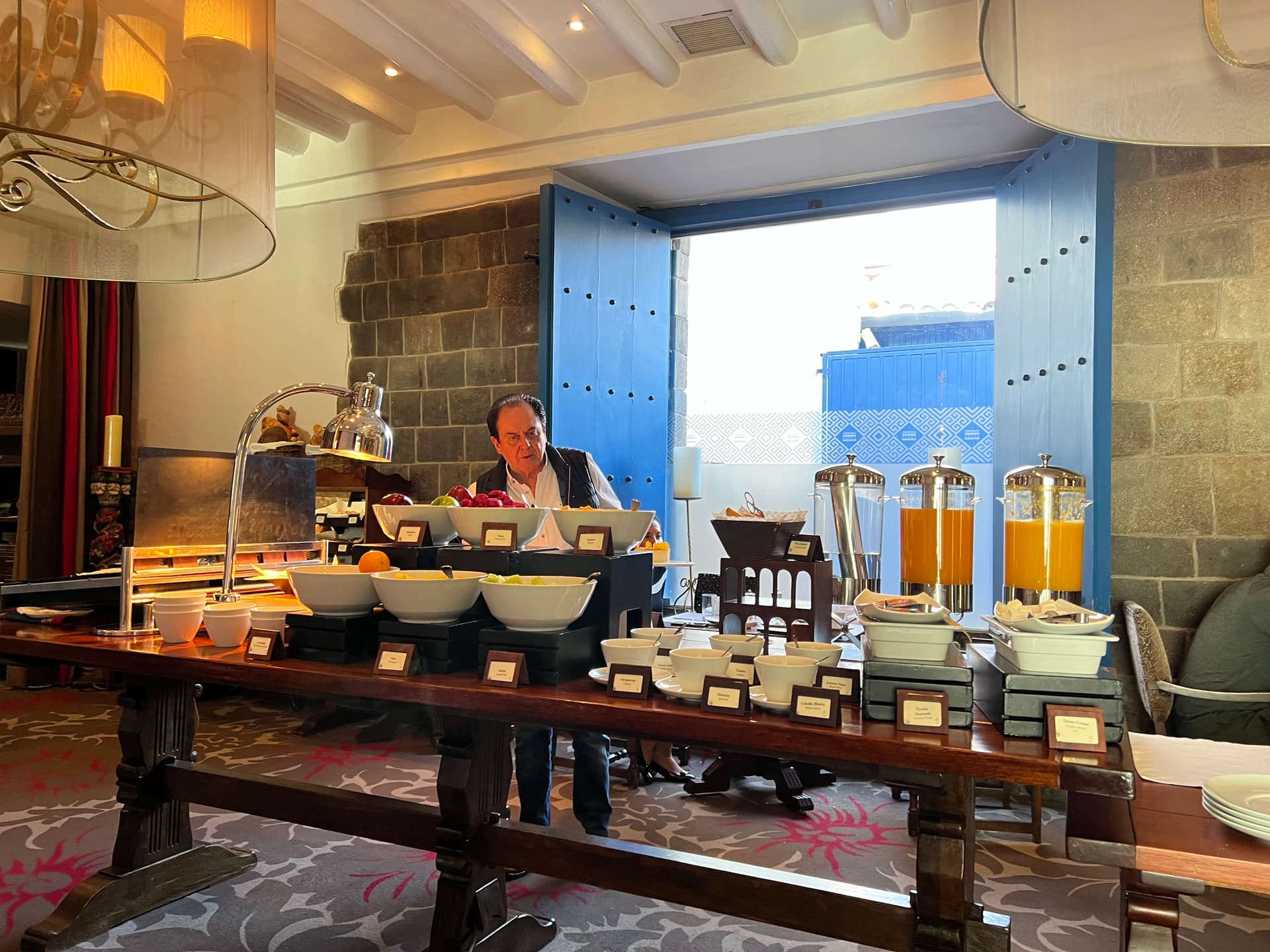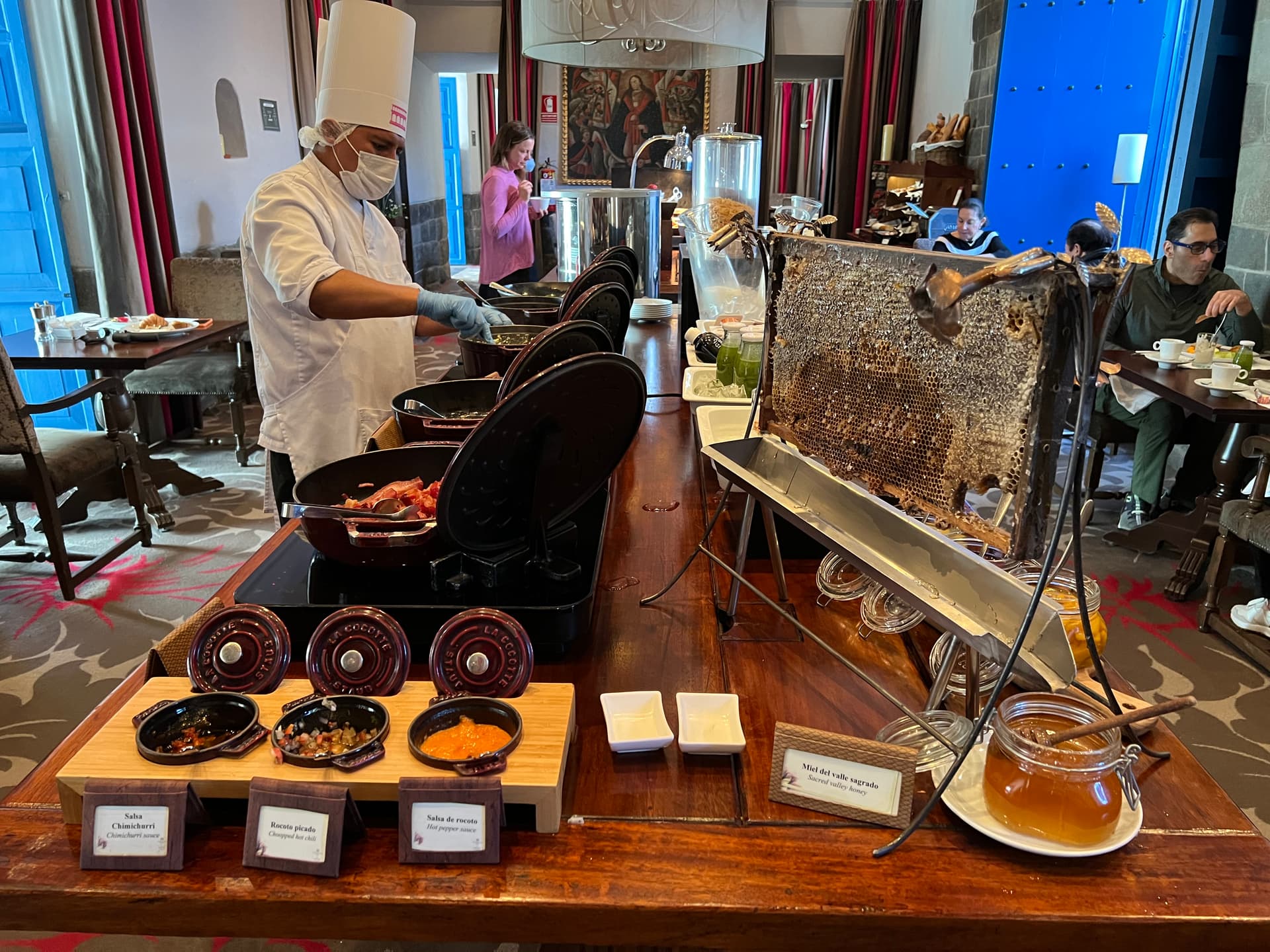 这家印加宫殿豪华精选的早饭是自助形式相当丰盛,餐厅的装饰布置从壁画到座椅都极具特色,也可以选择坐在走廊上晒着太阳用餐,不过这几天库斯科的日光有些强烈还是室内用餐吧 ![]()
