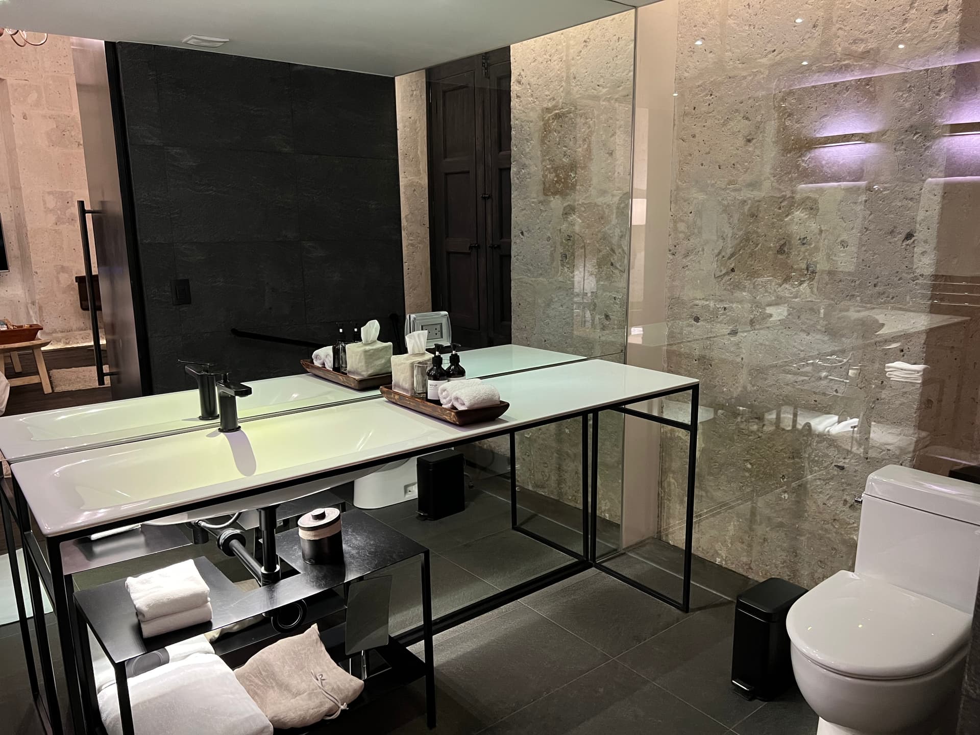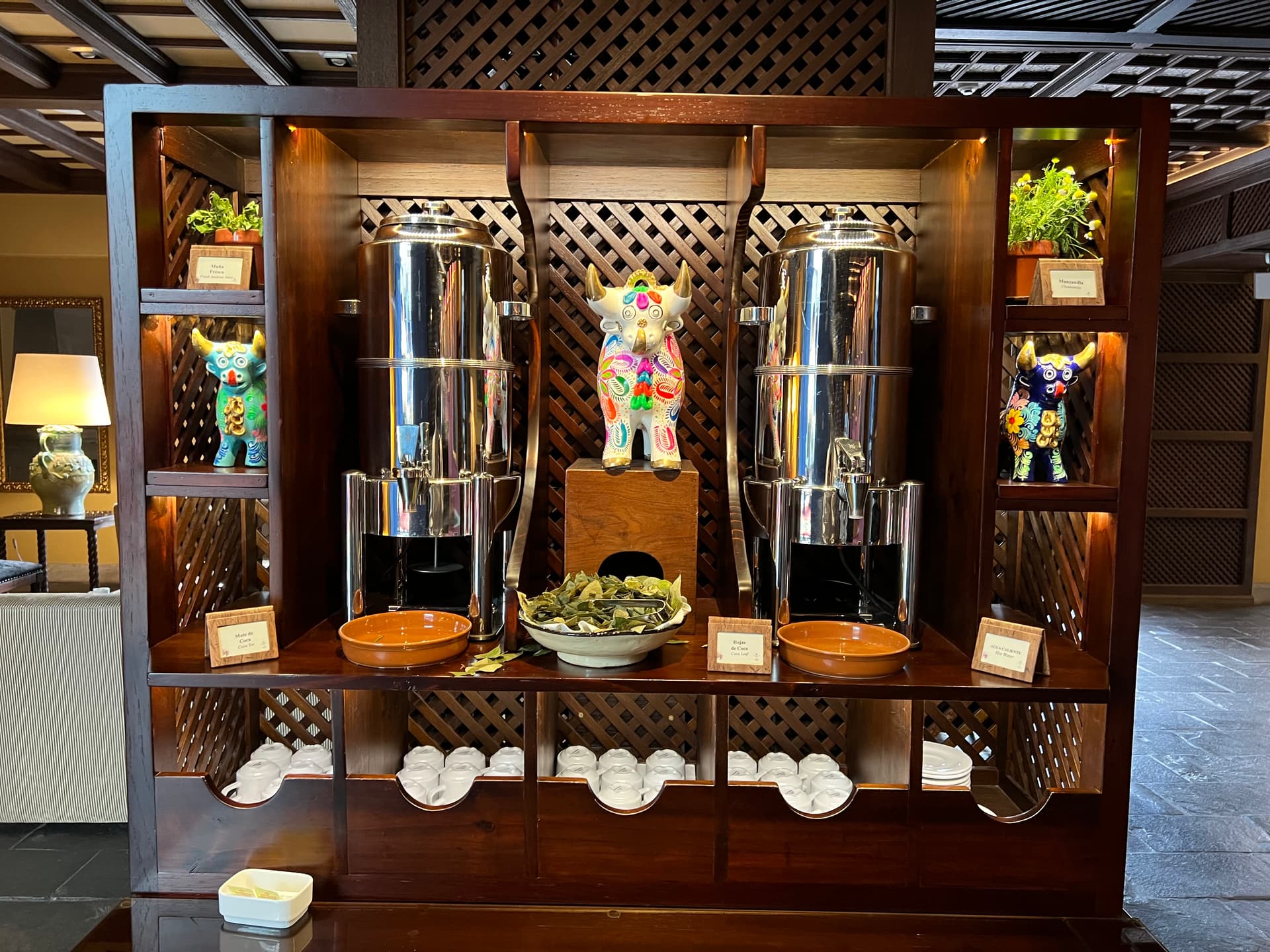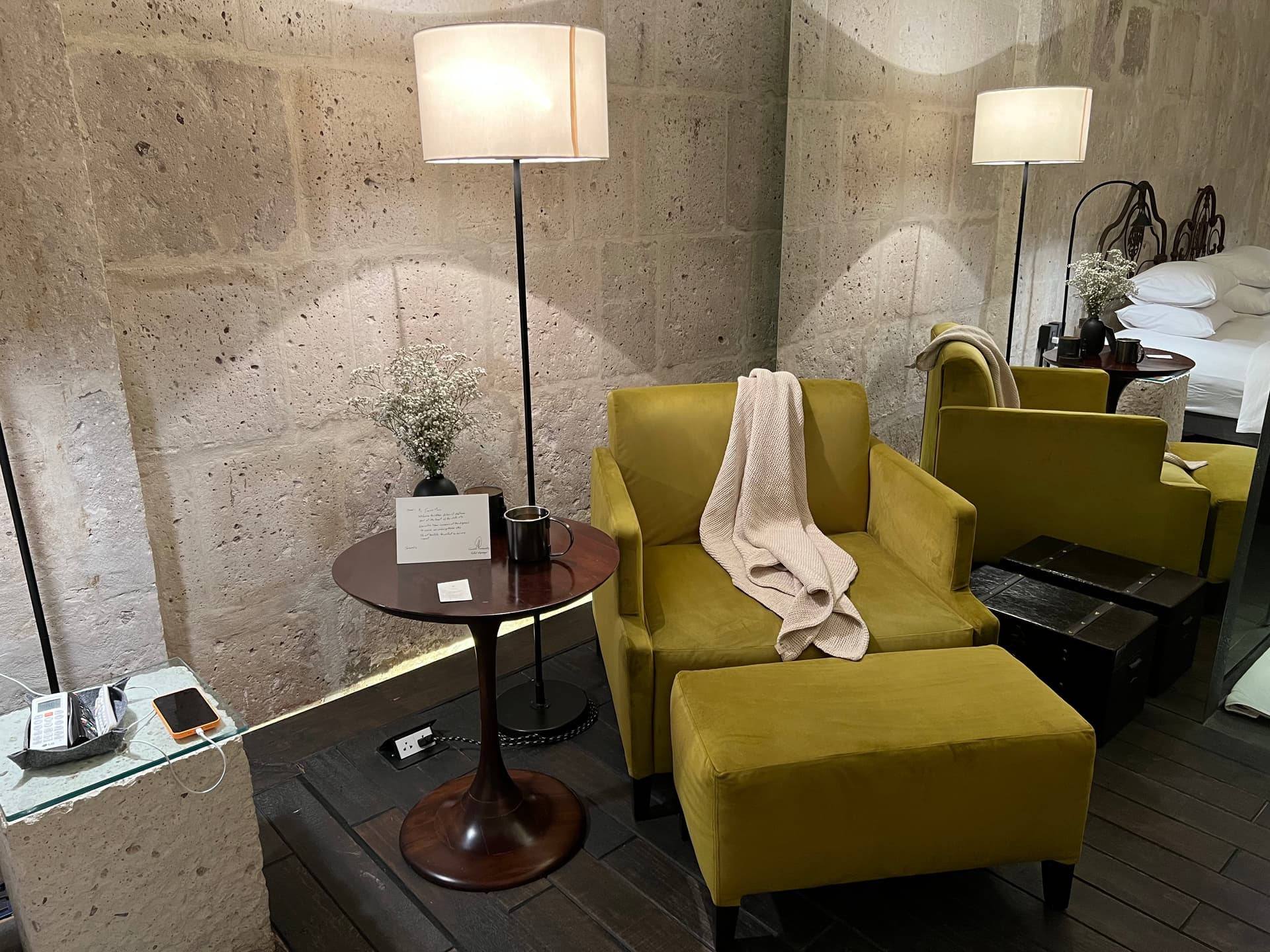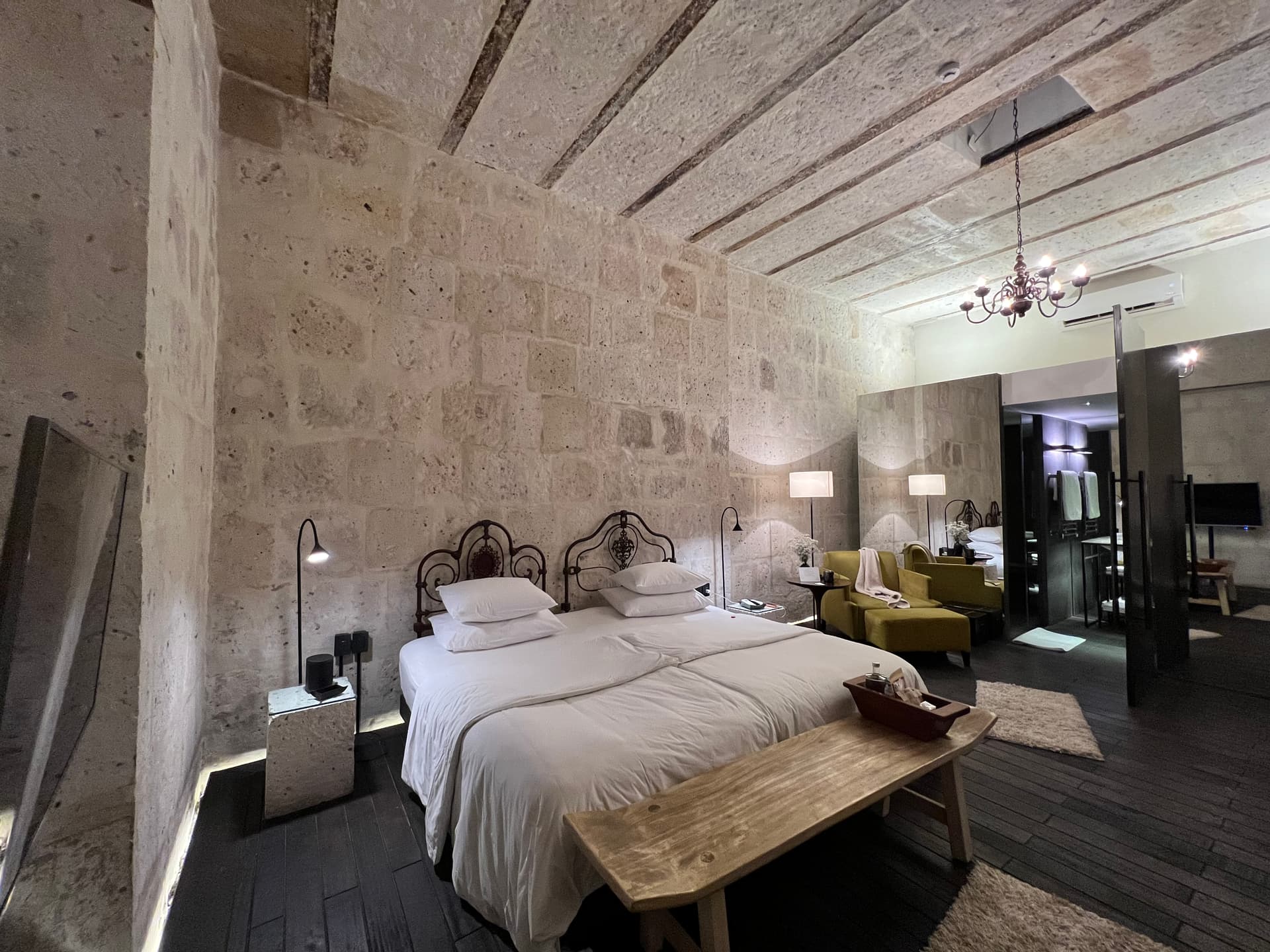 还挺喜欢这家罗莱夏朵设计风格的,不过分繁琐花里胡哨也不过分简洁冷淡,立足于阿雷基帕“白城”特点之上糅合了一些殖民风(吊灯和铁艺床就很欧式,高高的拱顶很修道院),现代化设计比如巨大的镜面、工业风衣架和洗漱台又丝毫不显违和,作为一家新酒店被国家地理杂志点名还是有点水准的。服务方面目前看来也一直在线,入住以后很快端来一杯用老干部不锈钢杯装着的茶水
