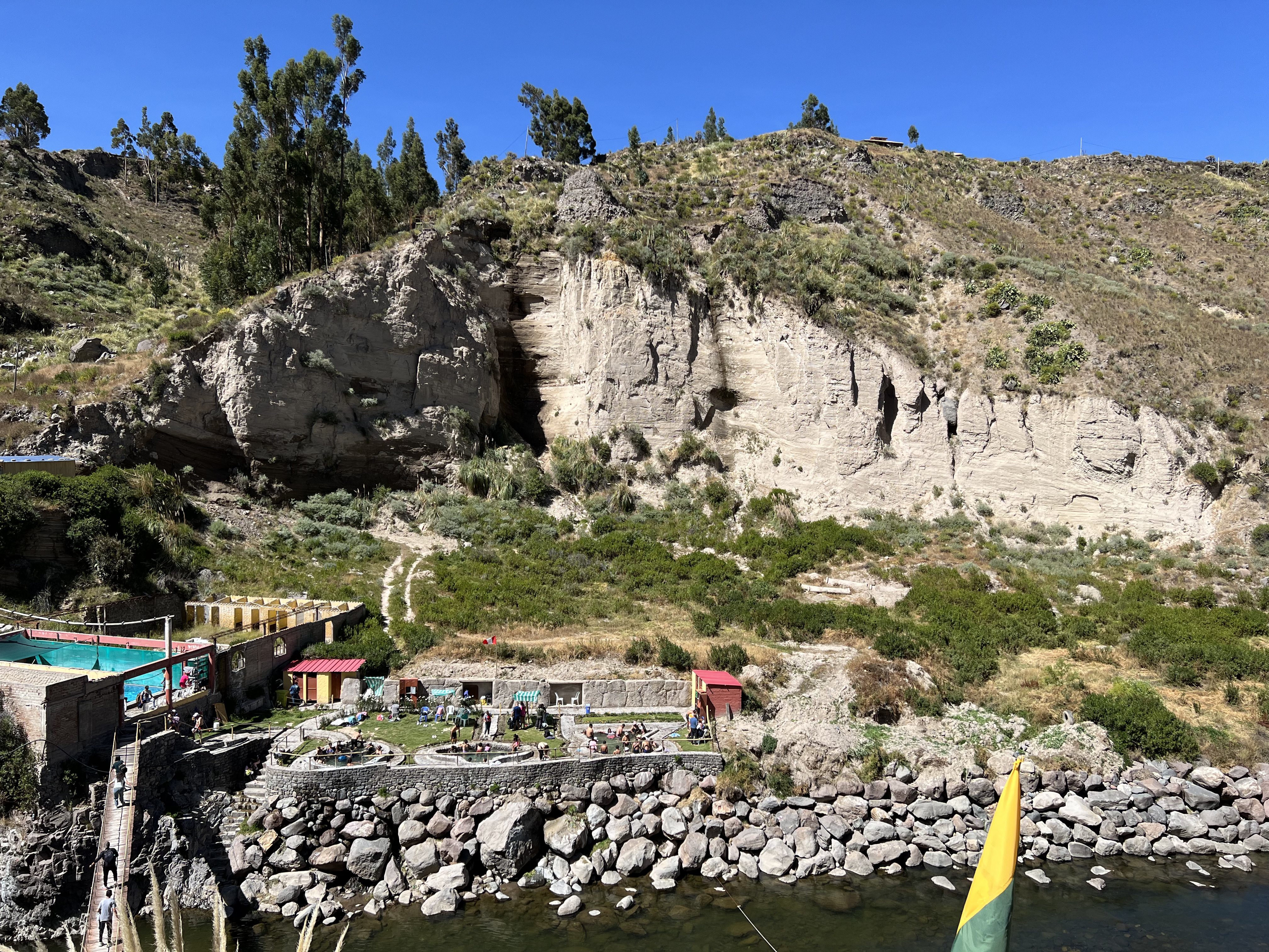 整个tour最大的槽点就是会把人带去一个温泉停留一小时,选择进去泡温泉的话15 soles一个人,我就站在外面刷了一个小时手机,温泉里的场面就跟下饺子一样,而且这种环境估计换衣服淋浴什么的都挺糟糕。意外收获是刷地图的时候发现怎么旁边有个belmond Las Casitas, 赶紧往对面山头望了一眼,再看看周边环境,觉得有必要先劝退一下泥潭朋友们,这家belmond不要来,虽然号称在Colca峡谷但实际上这里是峡谷的挺边缘地带了,景色不是非常壮丽,belmond所在的山头也不算高位置也不算好,belmond的正下方(对的就是垂直正下方)就是下饺子露天温泉浴场