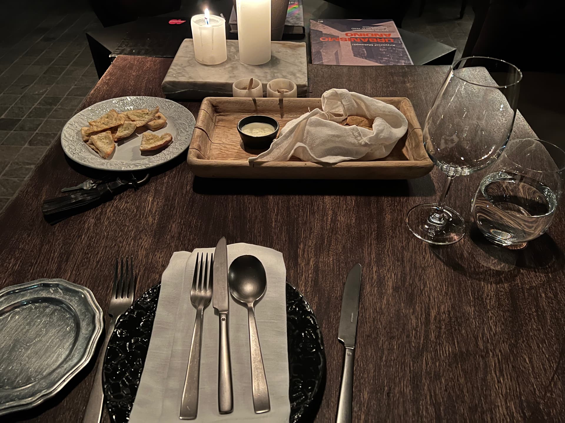 晚餐可以点一份前菜、一份主菜、一份甜点再附赠一杯酒,餐前小面包干很可口,虽然上了一大盘但是我嘎嘎地就全部干完了