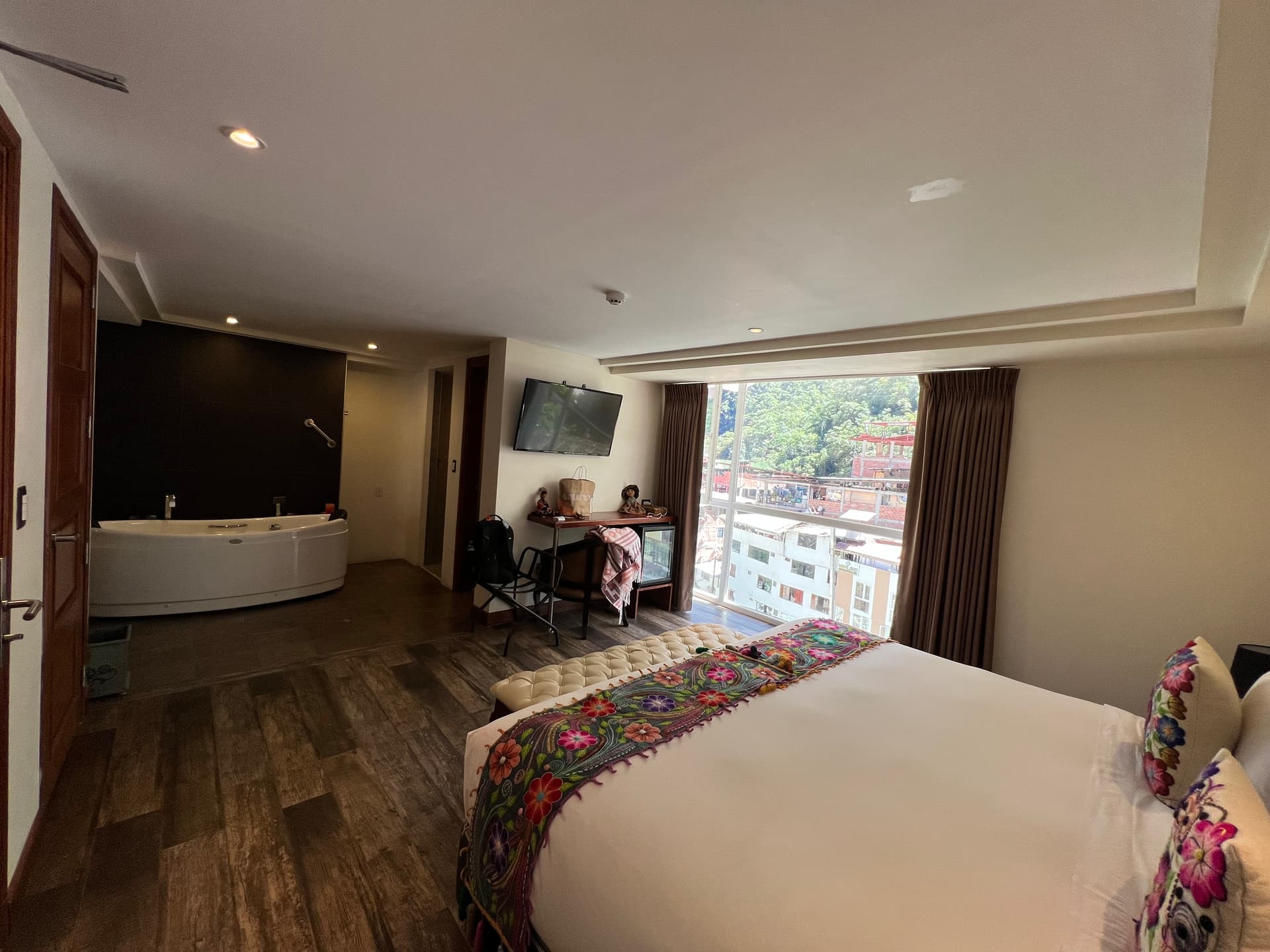 抵达热水镇出站以后就是一大片小商品市场,据考察发现热水镇同款商品价格比库斯科要贵2~4倍,建议所有纪念品在库斯科采购。本次入住酒店通过Expedia预定,100/天含早餐,位置临河非常好找,客房数量不多给了最高层唯一一间河景房:
