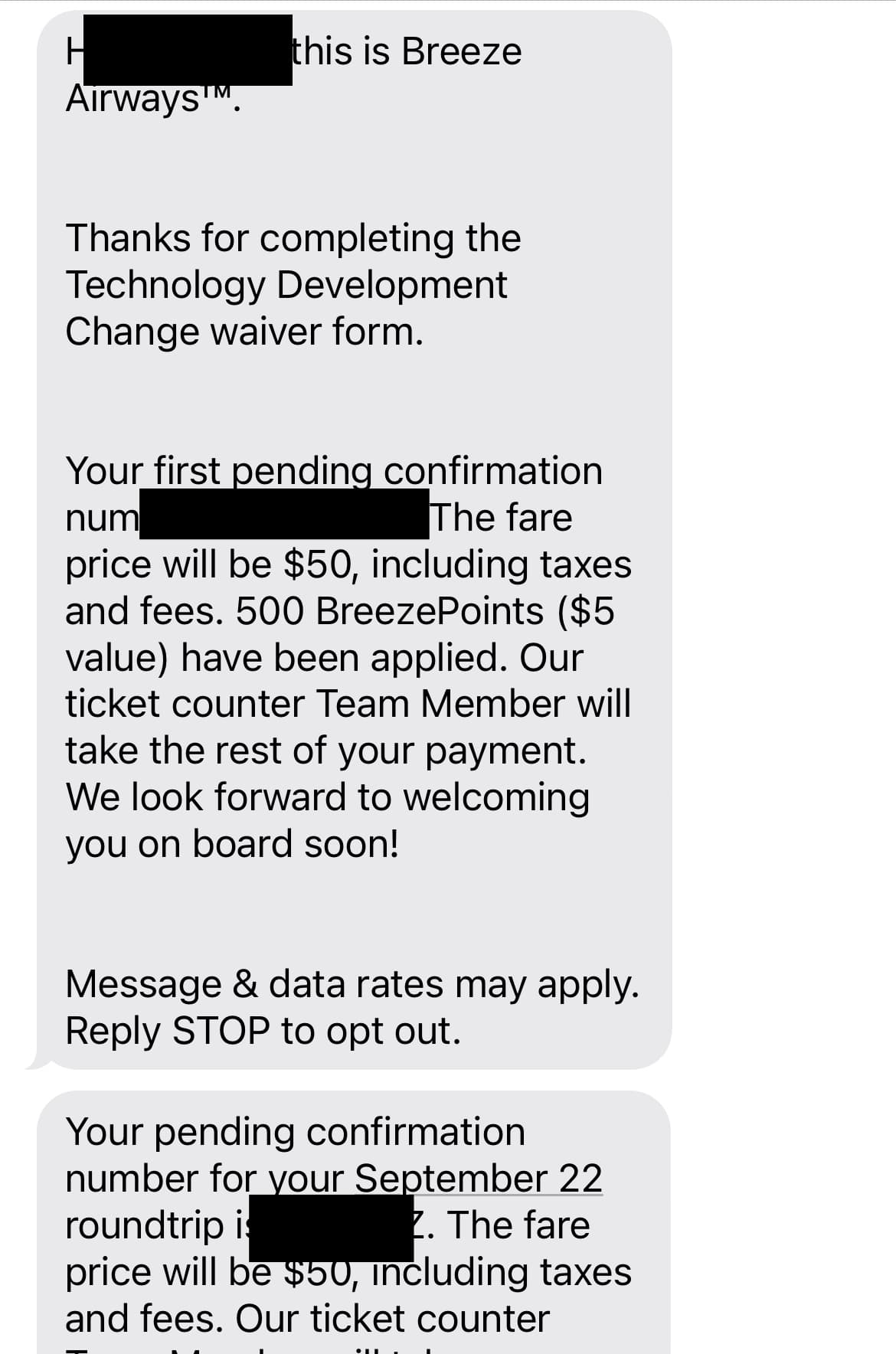 第三步:提交 form 之后 15 分钟,贴主收到了 Breeze Airways 短信发送的 pending confirmation code,一共有 6 个,每个对应一个 round-trip。