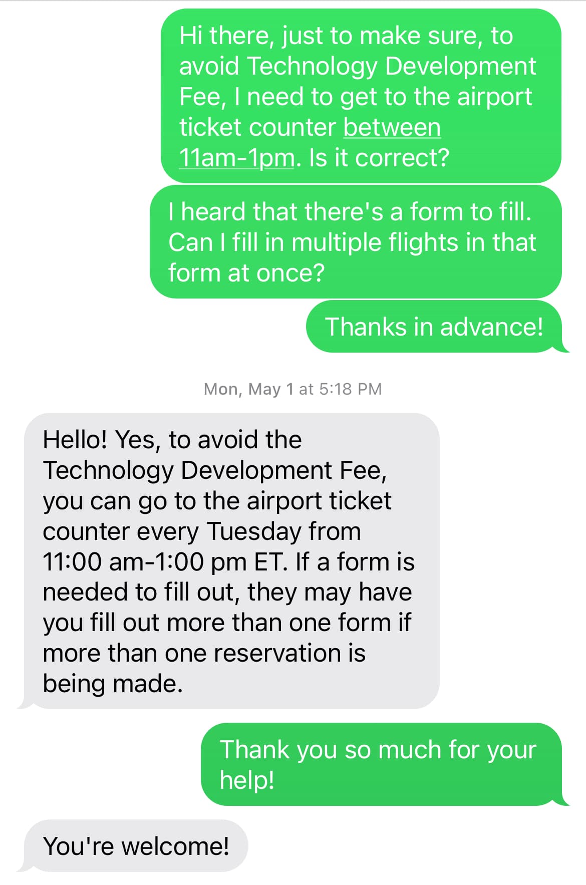 第一步:贴主先咨询了 Breeze Airways 的短信客服,确定柜台买票可以 waive 这笔费用。
