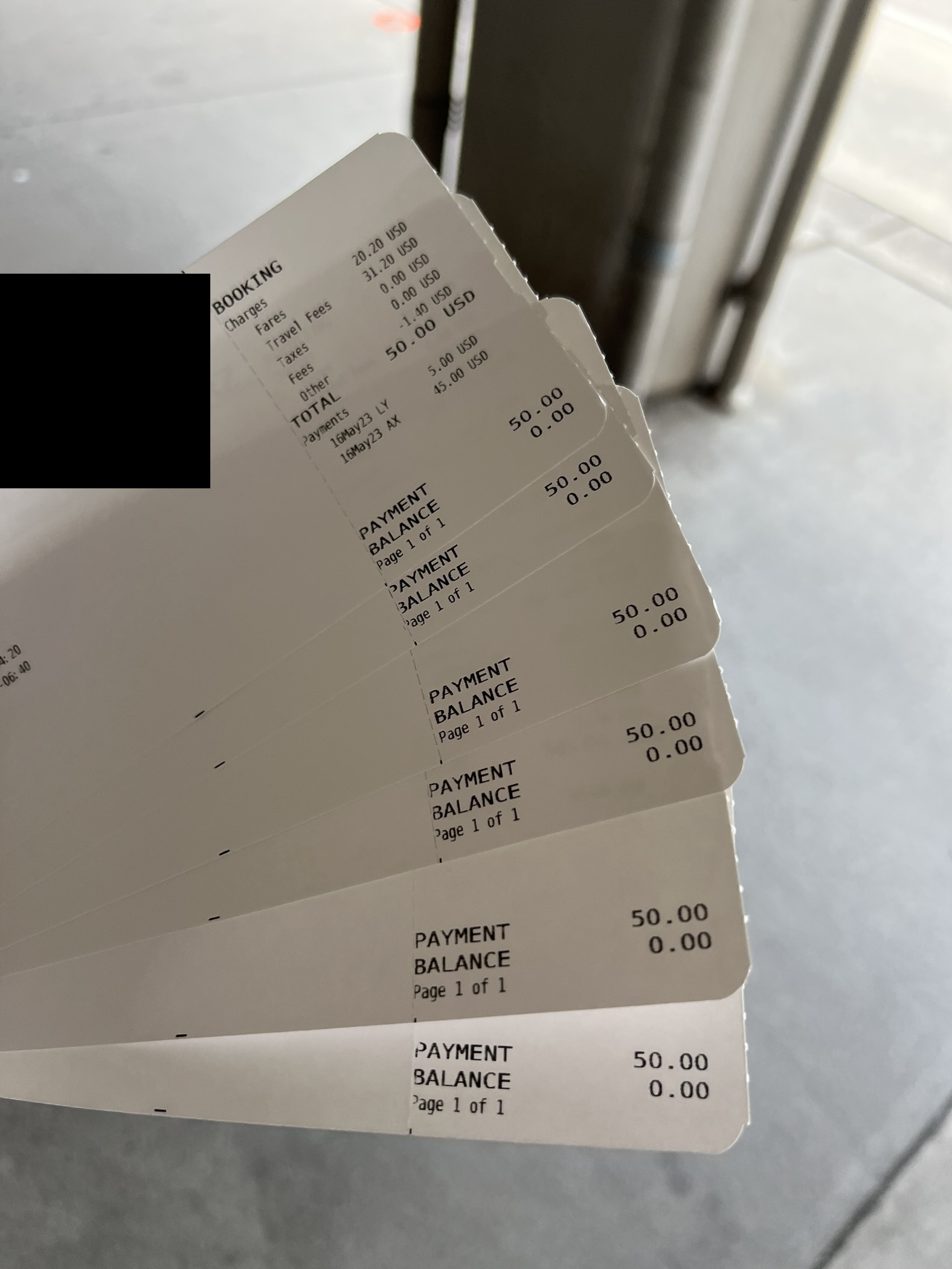 第五步:跟 agent 表明自己有 6 个 confirmation code 需要在柜台付费,agent 苦笑只得帮贴主一个一个操作,刷了 6 次卡。