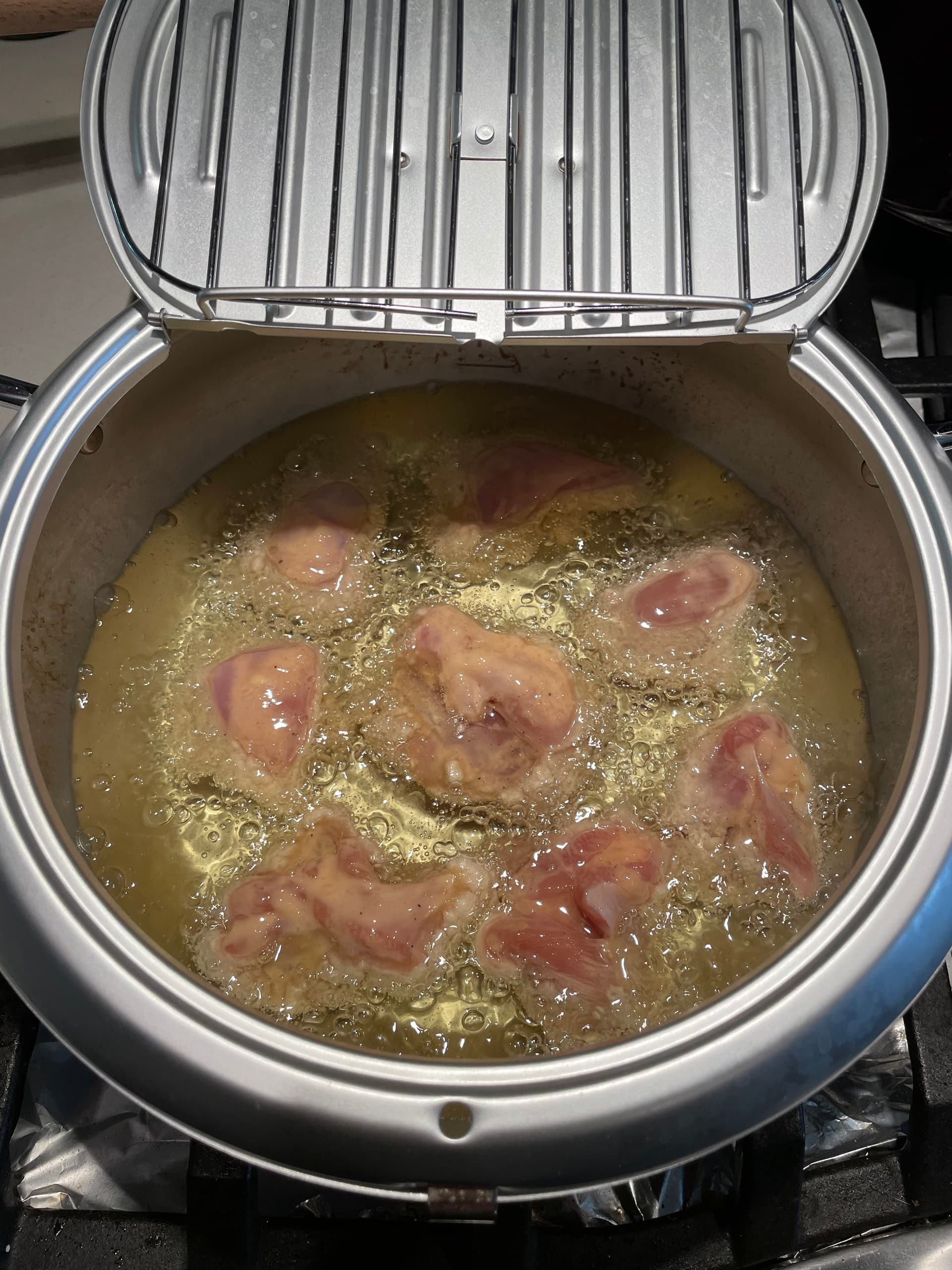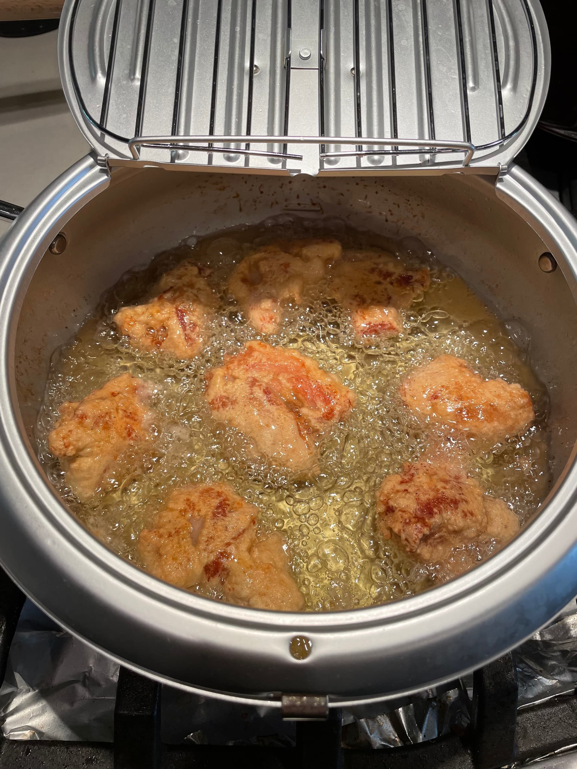 - 鸡块下锅,炸第一面。注意适量提高火力,鸡肉温度比较低,会迅速降低油温。