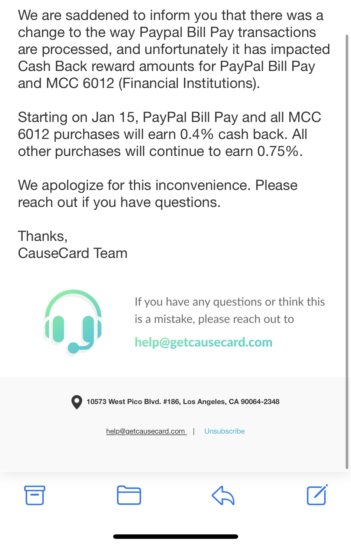 We are saddened to inform you that there was a change to the way Paypal Bill Pay transactions are processed, and unfortunately it has impacted Cash Back reward amounts for PayPal Bill Pay and MCC 6012 (Financial Institutions).