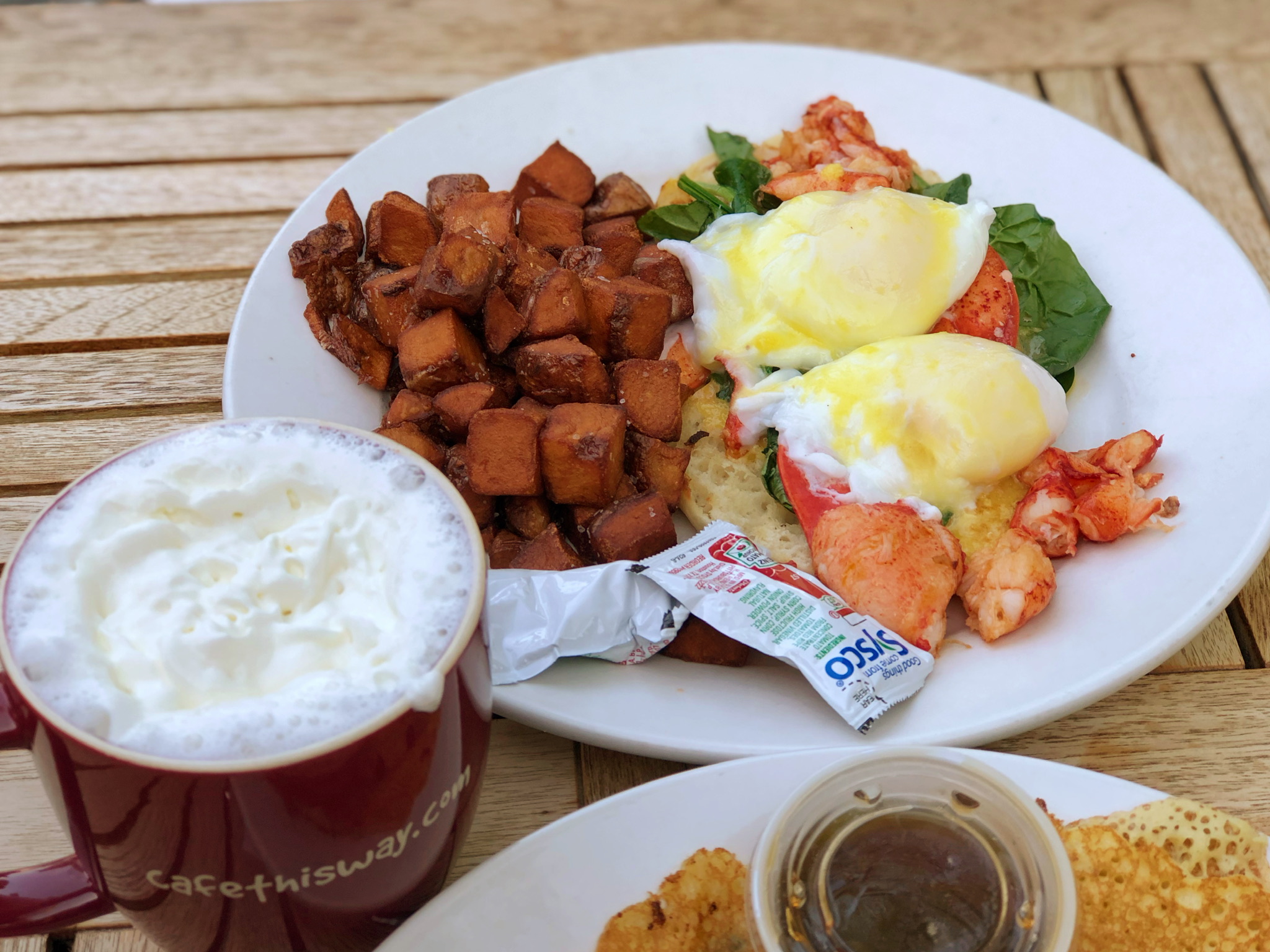 到Cafe this way的时候已经很多人在等位了(都是山上看完(不存在的)日出下来的,不过很快就有座了。街趴很好找,好像9点之前免费。Maine食材两大宝:龙虾和蓝莓,早饭自然也不能放过 Lobster Benedict和Blueberry pancake都好吃,white chocolate简直救命稻草 吃饱喝足心满意足回酒店睡回笼觉了