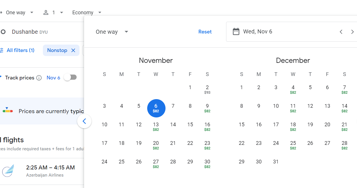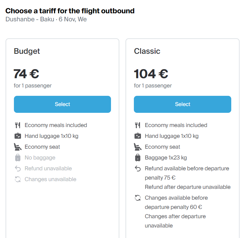 连接杜尚别和巴库的稀有航线喜迎降价,原来 $200+ 的单程票今年冬天仅 74欧 ($82) 的白菜价,航线最远到明年3月底。当然,这个是 basic economy,如果要包一件托运行李的话要加30欧元 (104欧)