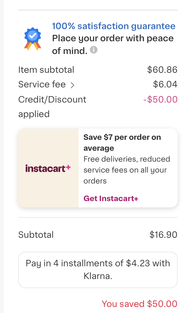 新号应该自动有7天的instacart+来减几刀的服务费吧