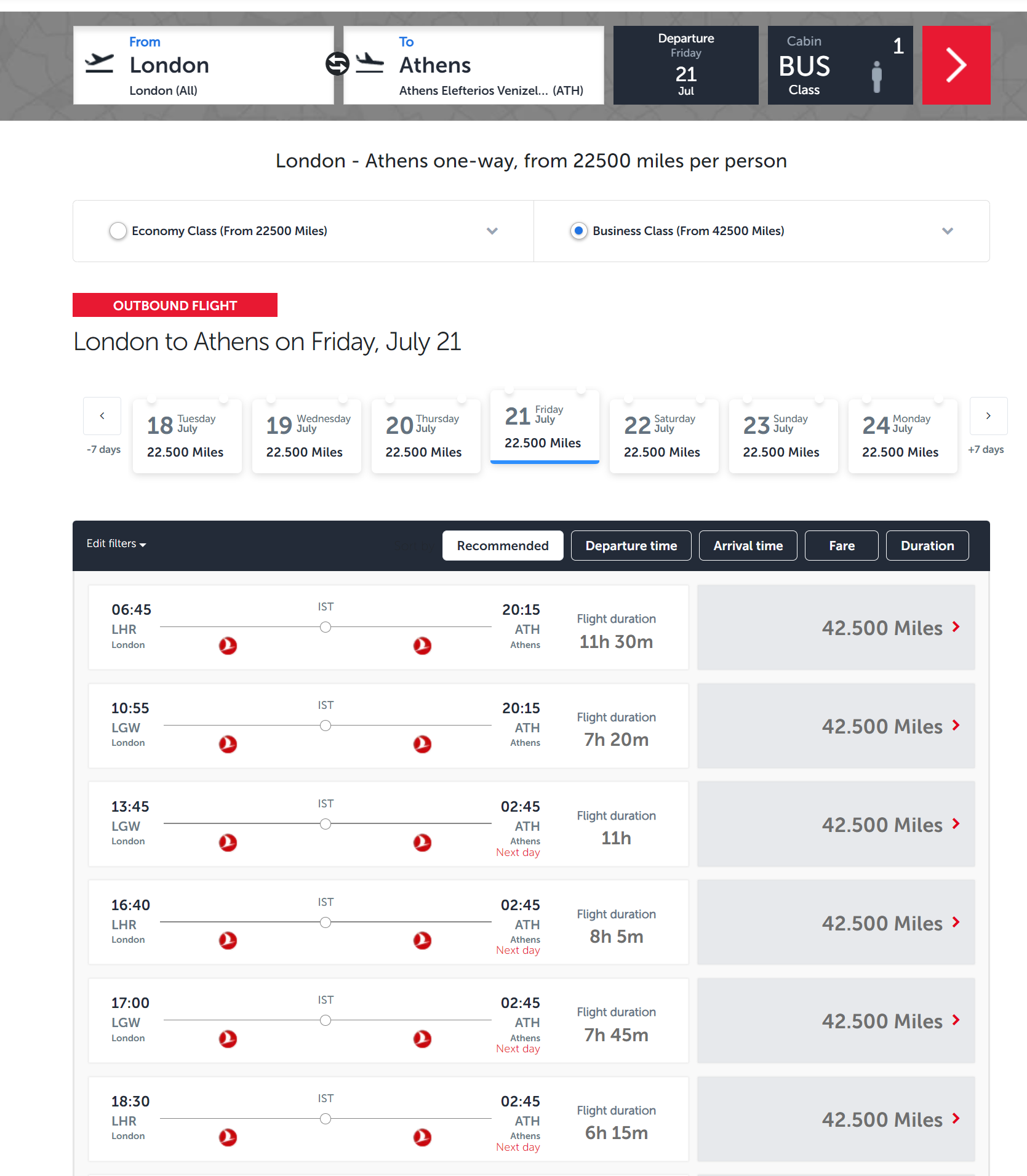 比如July 21: London → Athens. 在土耳其航空自己的官网可以搜到很多的里程票,经济舱和商务舱都有。