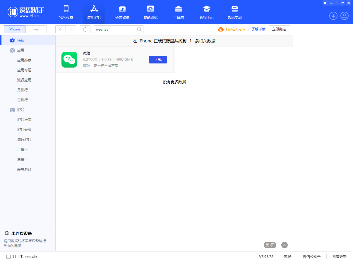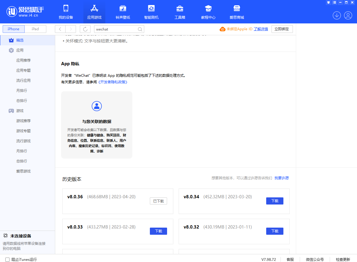 搜索找到 “微信”,点开 “微信”(不要点击下载),移到下面选择历史版本下载即可。