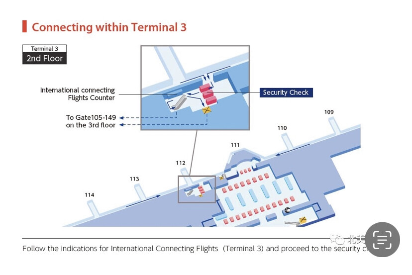 3.下飞机入登机口按照绿色指示牌international connecting flights往Gate 112走