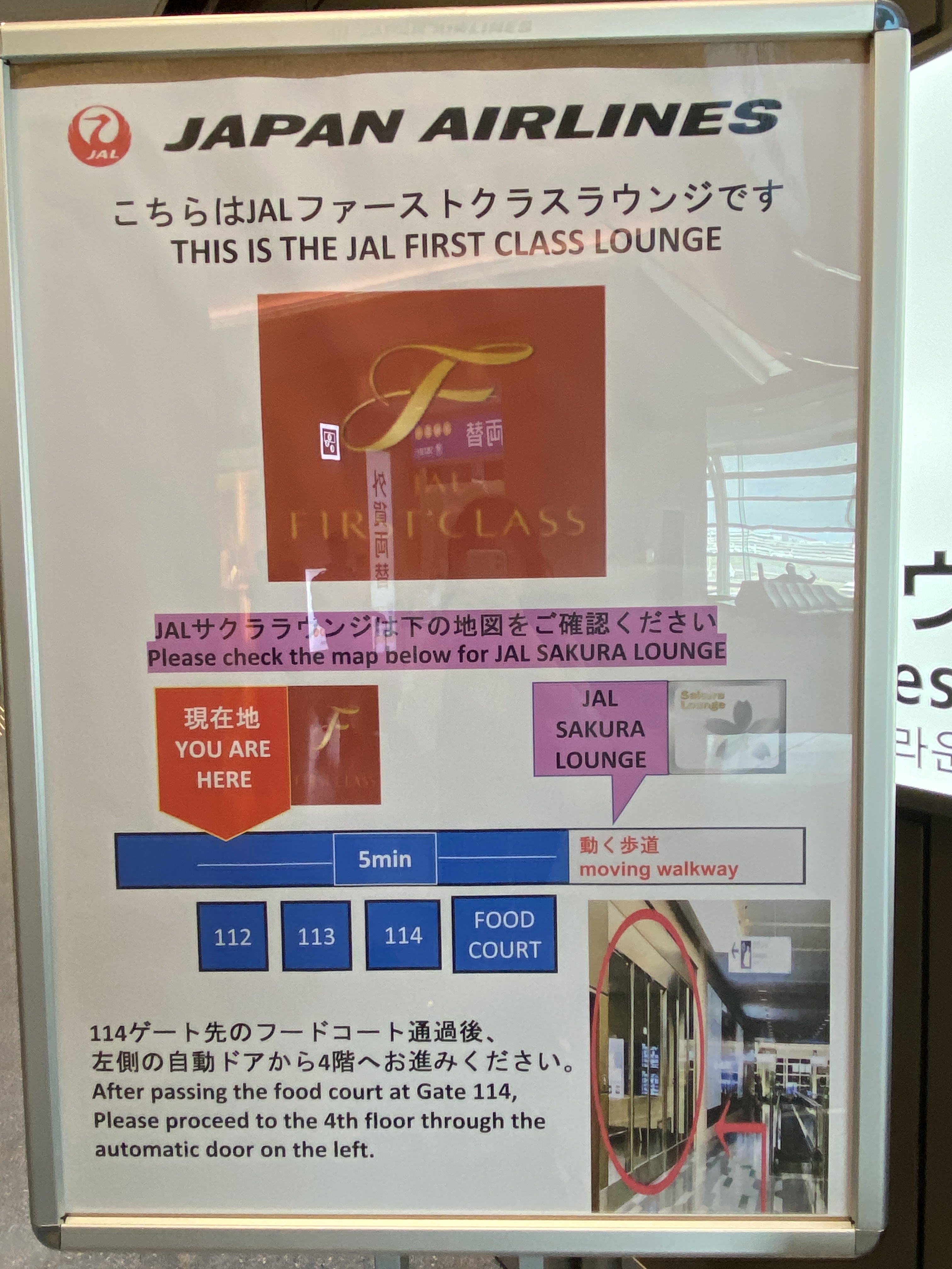 8.登机牌会标注可使用lounge。机场内部大型电子指示图说lounge在Gate 112附近,但实际上JL first lounge 和 sakura lounge位置不同。