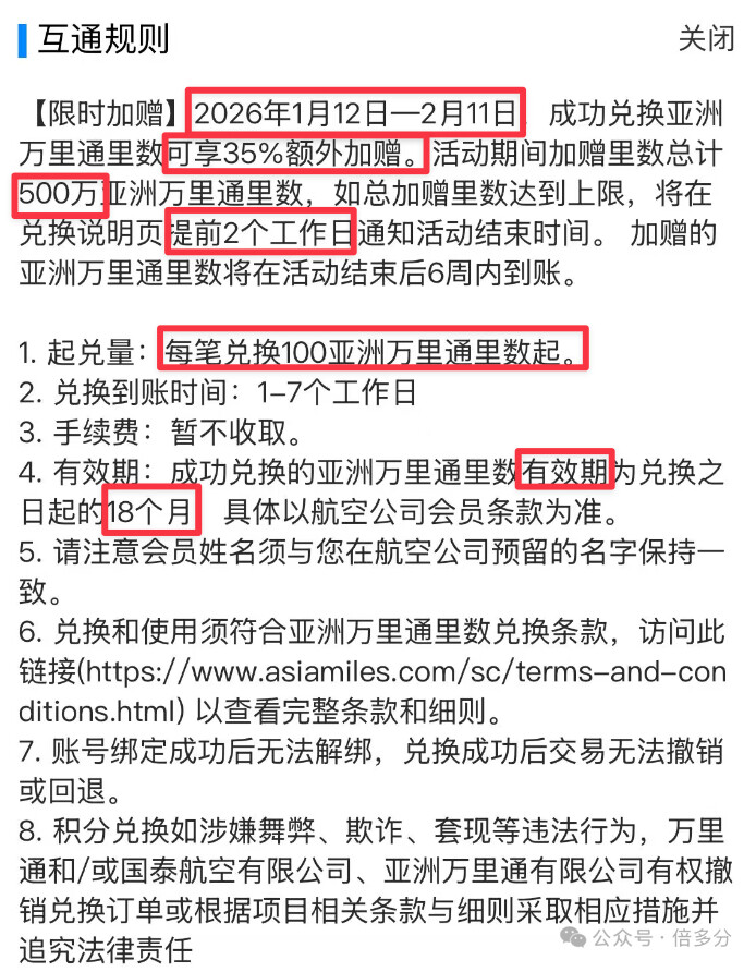 加赠上限:活动加赠里程总上限为500万亚洲万里通