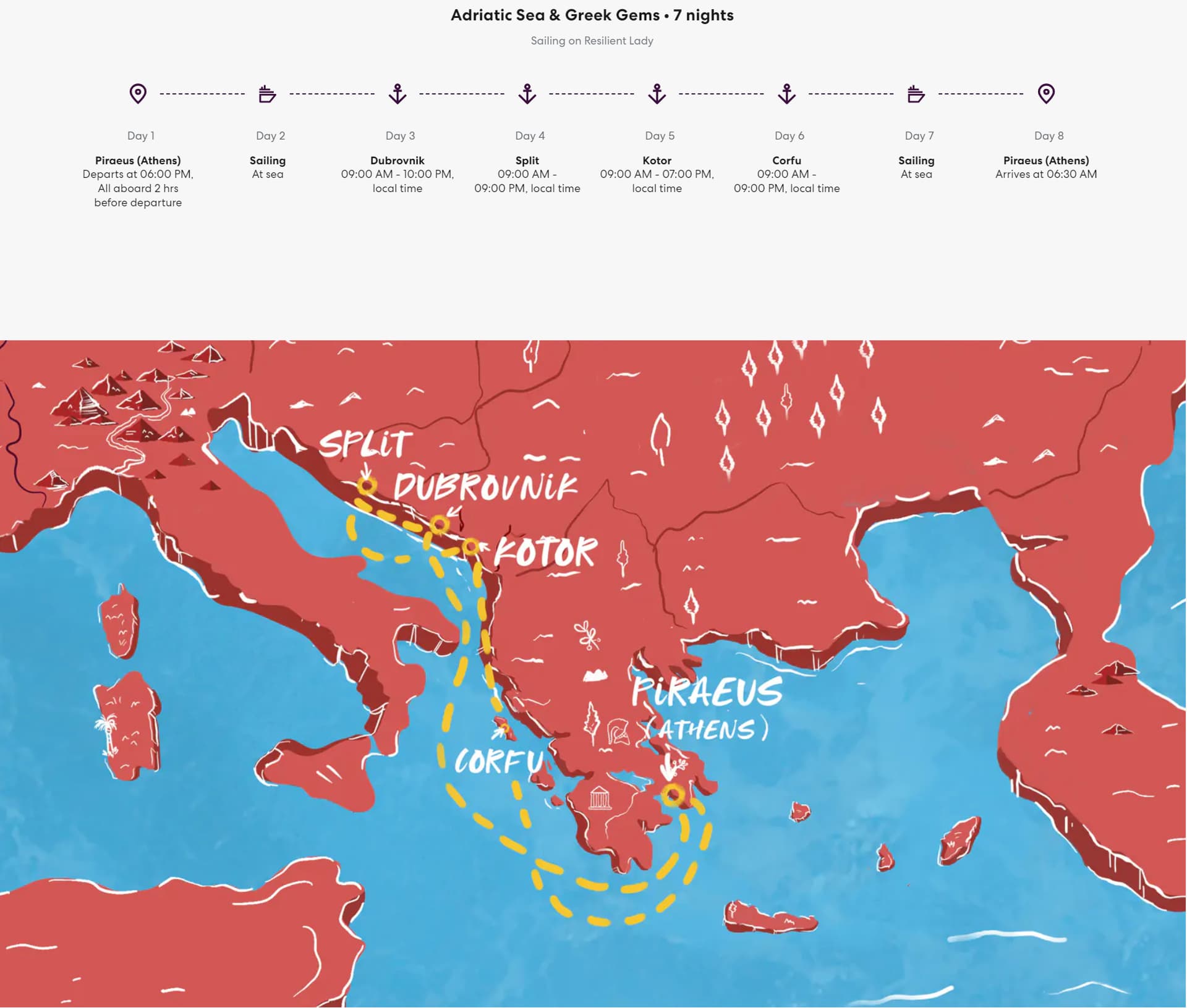 邮轮会经停克罗地亚的杜布罗夫尼克、斯普利特,黑山的科托尔,和希腊的科孚岛。