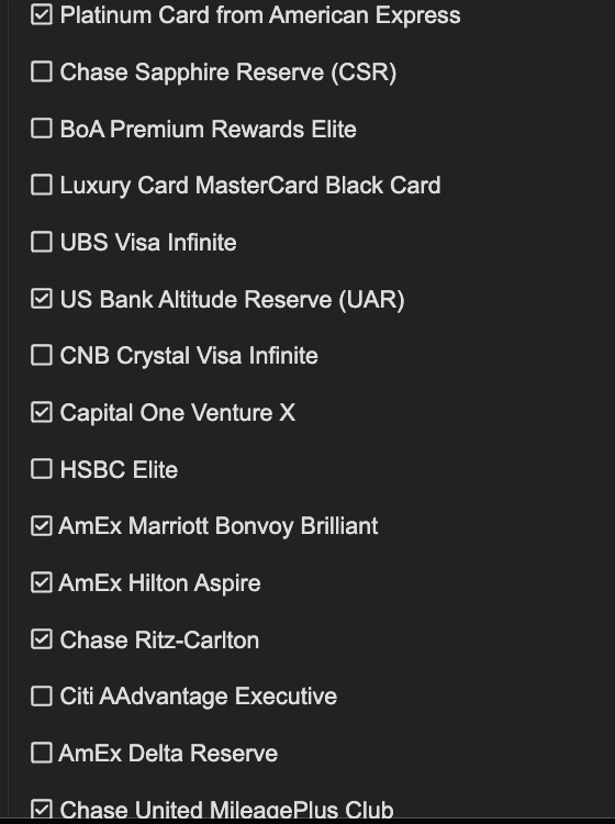 以下是选项中常见的高端卡,主要分为三类:银行点数卡、酒店卡和航空卡。点击卡名可以进入站主博客查看各自的具体福利。