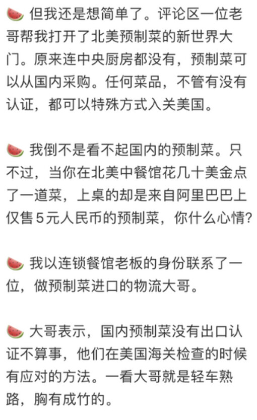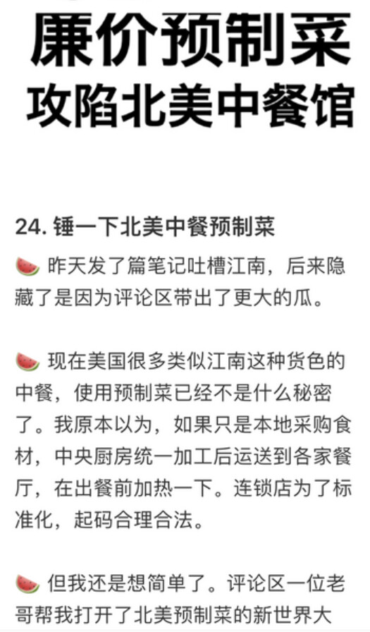 有句讲句,如果美国中餐馆真的能买到国内大连锁品牌的预制菜,我是乐于捧场的。再怎么说也比莫名其妙的fusion和美式中餐好多了。