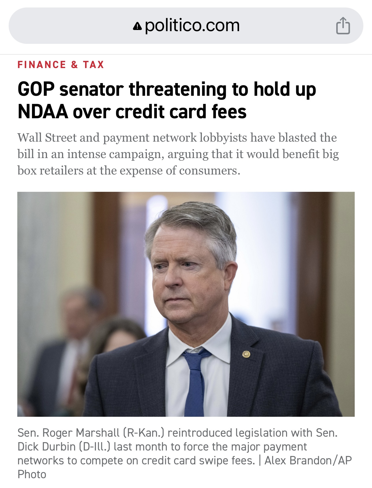 今天堪萨斯州参议员Roger Marshall竟然威胁如果他和伊利诺伊州参议员Dick Durbin的Credit Card Swipe Fee Bill不在参议院进行投票的话,他就会hold up今年的国防预算草案。