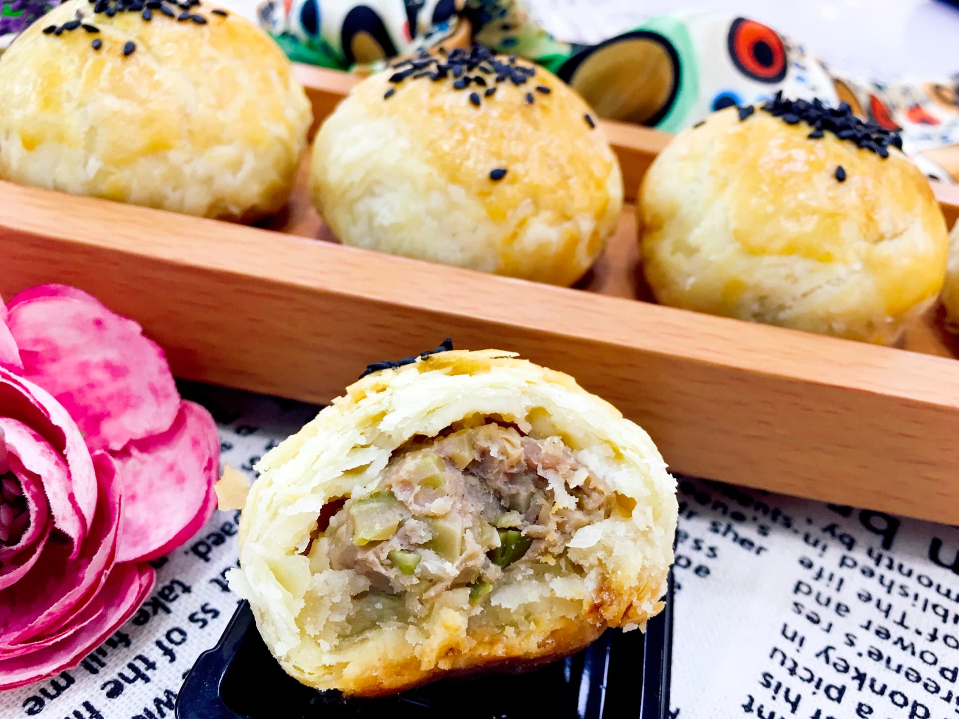 鲜肉月饼 酥皮热量炸弹 我也觉得挺好吃 就是榨菜馅有点令人惊讶 就像日本人榨菜下酒一样 有点迷