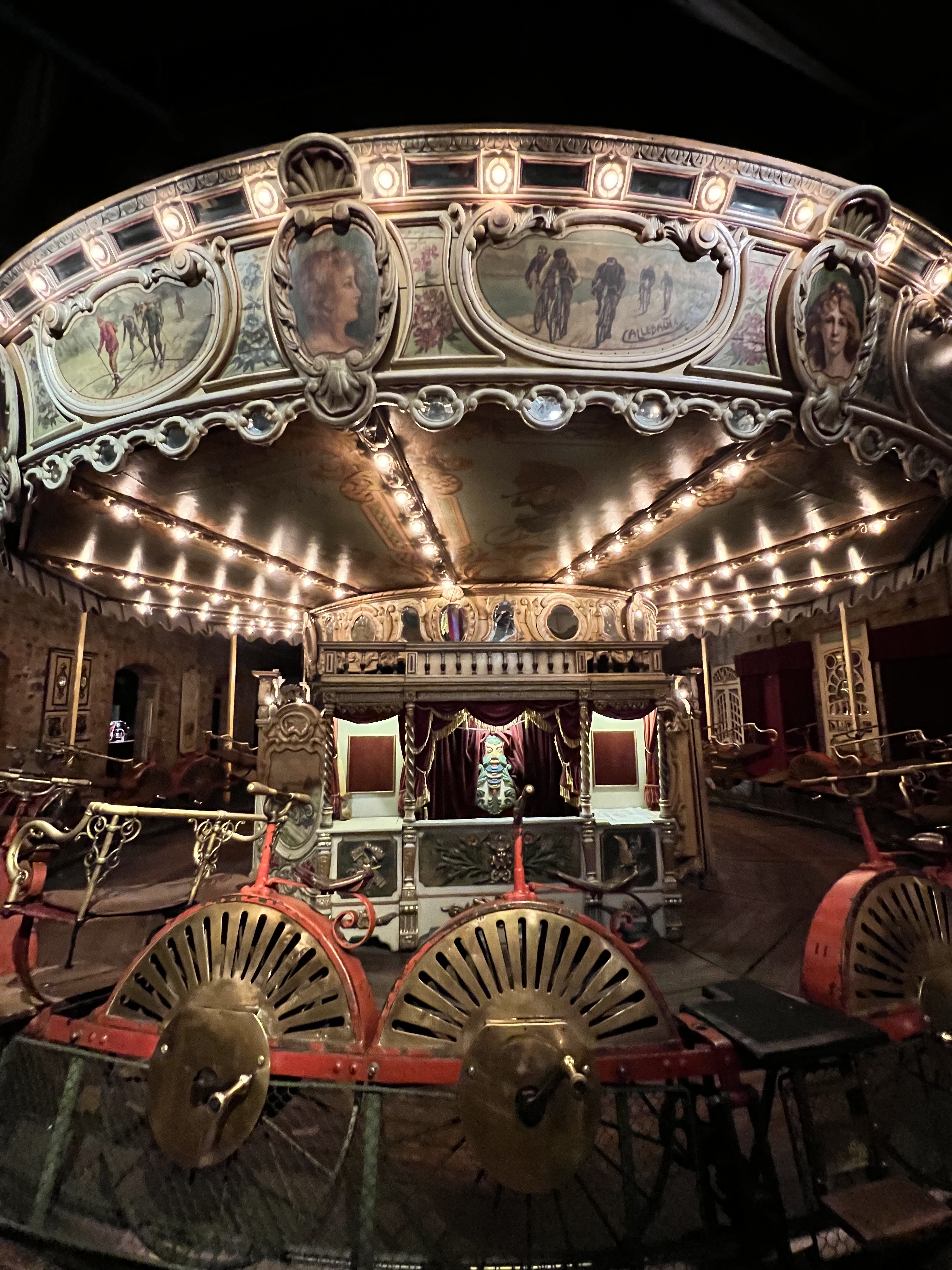 大家熟悉的卢浮宫,奥赛就不说了,这次推荐一个略小众的景点 Les Pavillons de Bercy - Musée des Arts Forains https://arts-forains.com/, 需要提前预定tour,有英语的.里面有很多可以玩的老式的游乐园设施,比如19世纪末20世纪初的赛马机器,自行车旋转木马之类的.结尾压轴的自行车旋转木马是要大家自己骑的,非常刺激,因为可以转的非常快,他们自己的记录是将近60公里每小时在转圈,我都要被转吐了. 旁边有个cour de saint-emilion是个新的商业区也可以顺便逛一逛. 我发现不知道今年法国是不是缺电,我的同事说他们有个新法律说空调不可以低于26摄氏度,所以我在很多地方都觉得不知道是不是没开空调,被热的够呛.