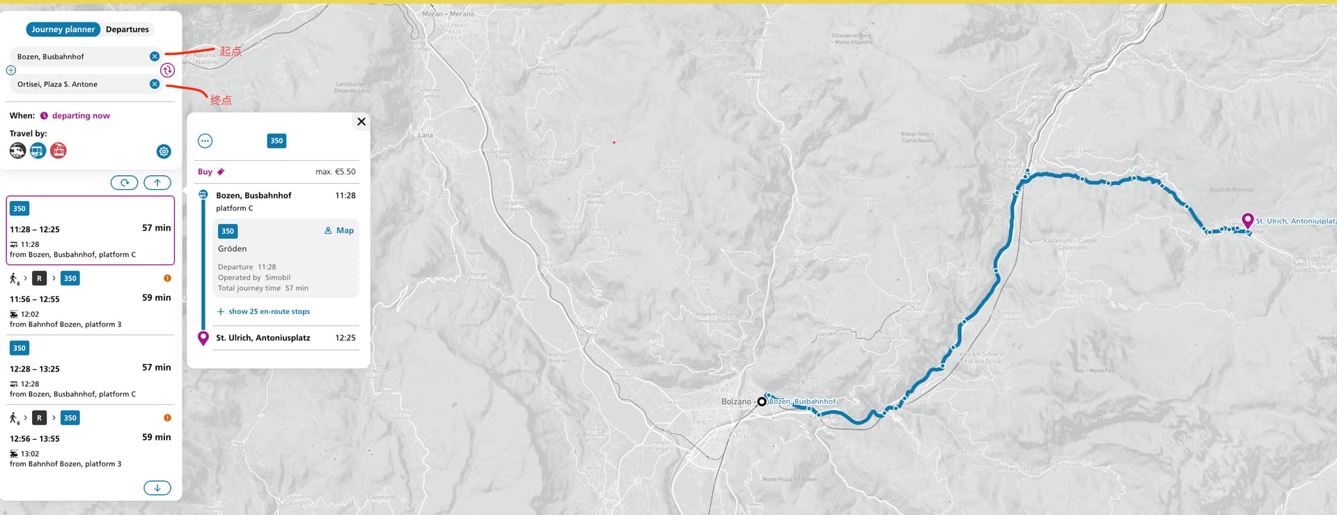 使用范例:我们想查询从Bozen(博尔扎诺)前往Ortisei的公共交通。一个城市内往往有多个公交站点,从博尔扎诺出发,最方便的是博尔扎诺公交总站(Busbahnhof),而目的地Ortisei没有巴士总站,取而代之的是市中心广场Plaza S. Antone。