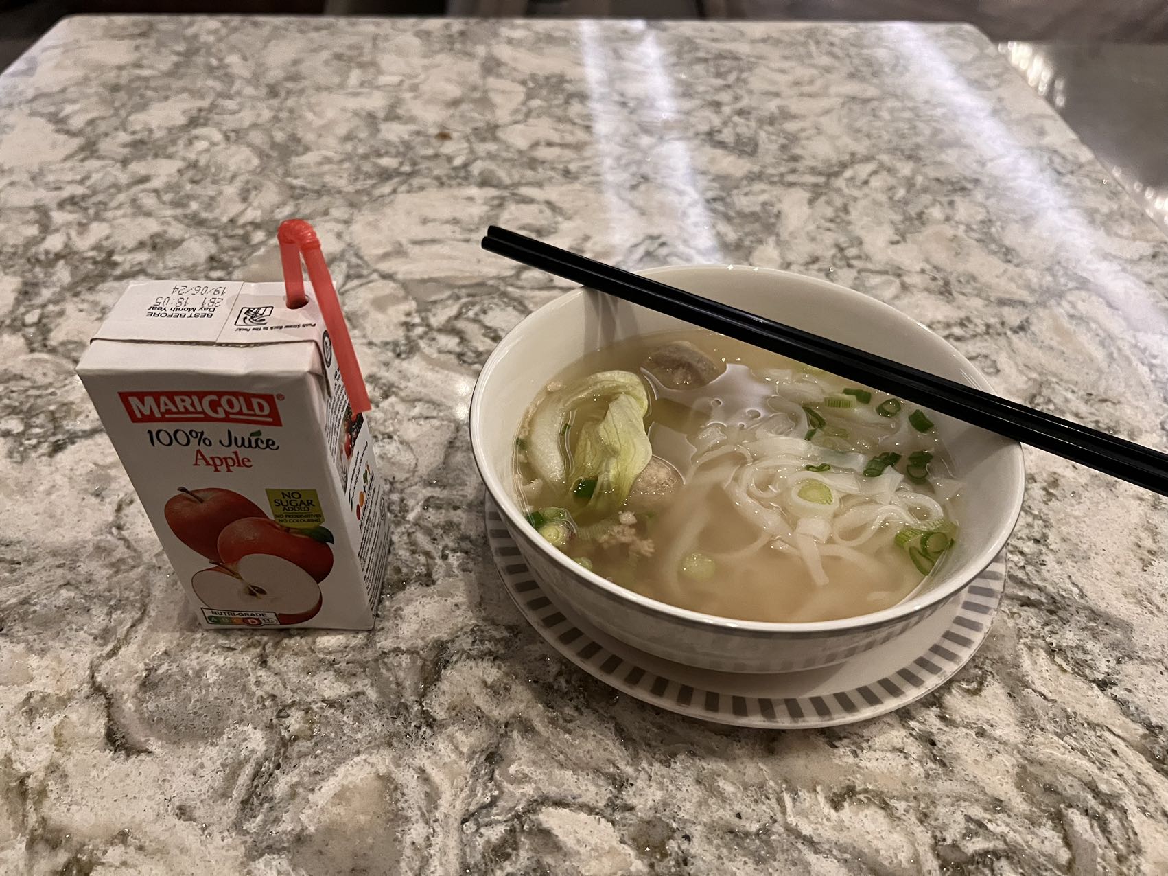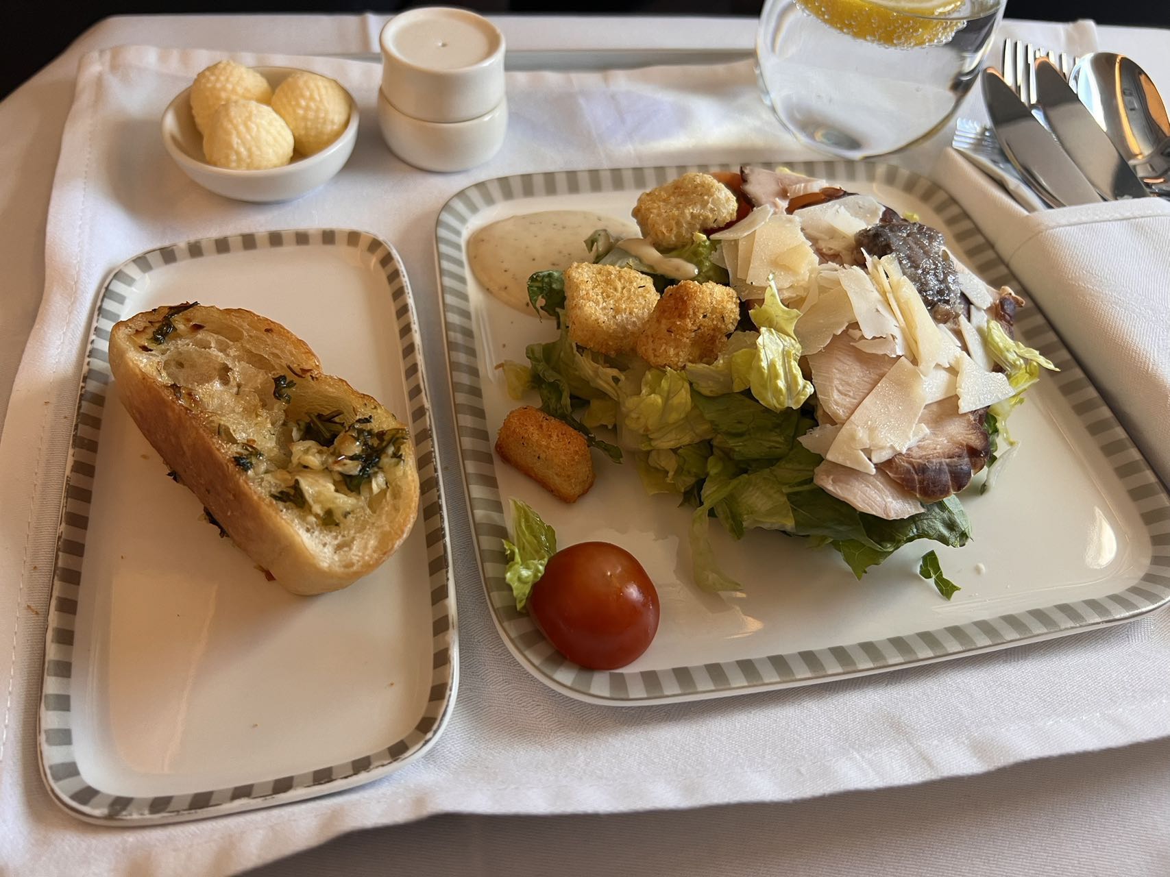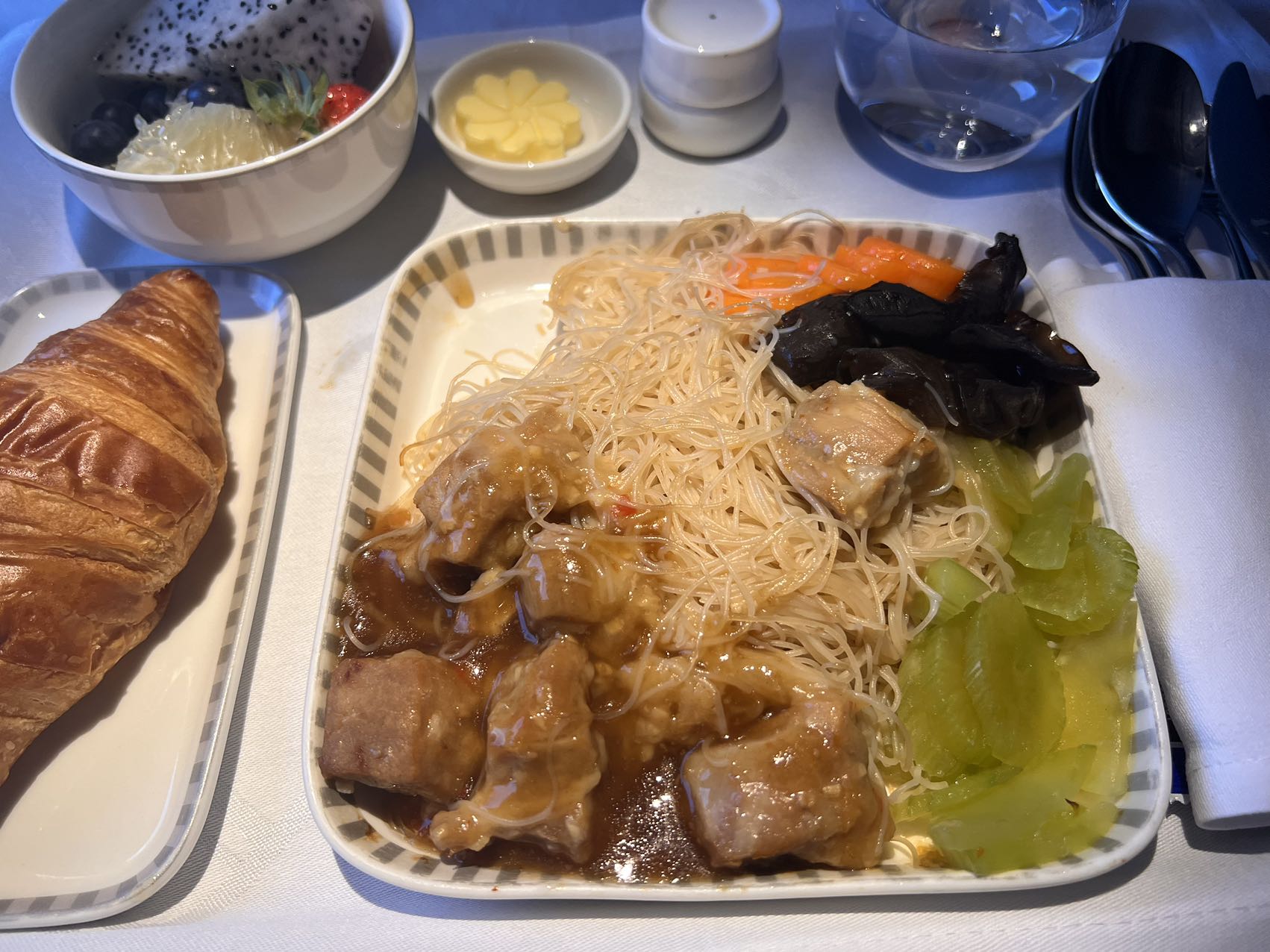 主菜是提前点的云吞面。里面的叉烧肉超大块。云吞里的虾也是超大块,很新鲜。面就是普通的云吞面。就是汤有点咸,我喝多了,导致航班的后半段整个人都处在缺水的状态。