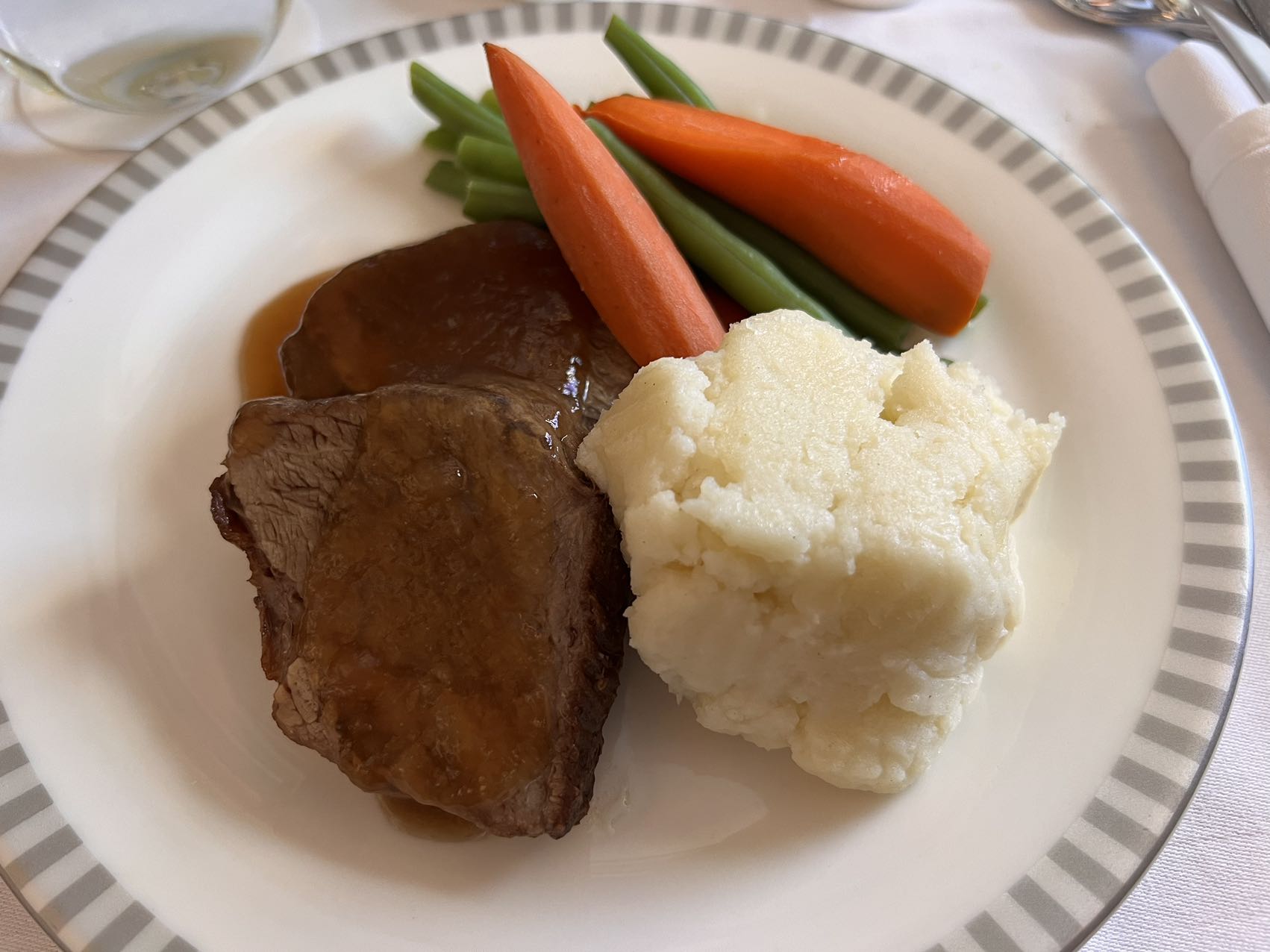 再然后才是主菜。土豆泥和牛肉都很入味。胡萝卜和青豆不入味(意料之中)。牛肉很嫩很软。唯一缺点是牛肉有点咸。