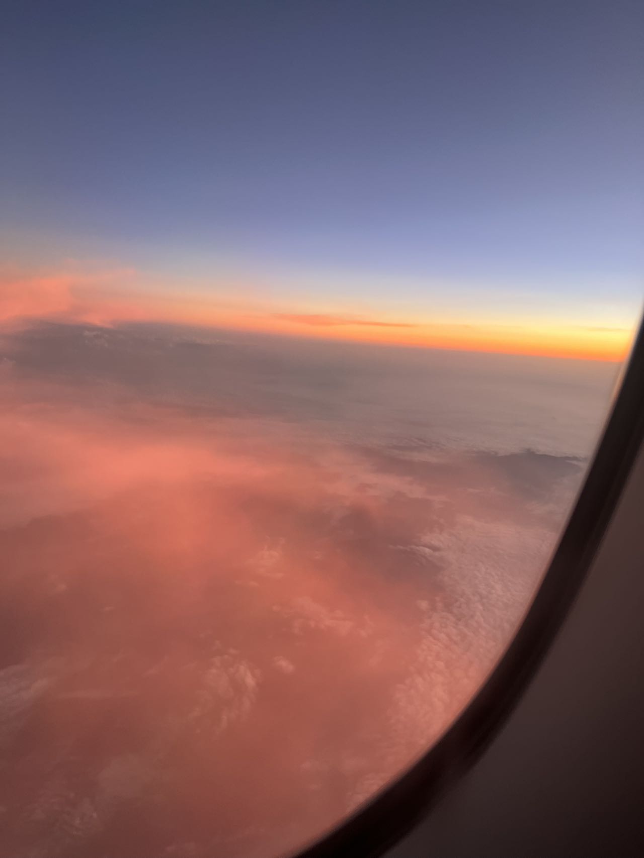 飞到江西上空时,东边的云染上了一丝橙黄色的光晕。日出时间到了。光晕一点点扩大,慢慢把云层都染成了红色。然后天际线被染色,直到天光大亮。