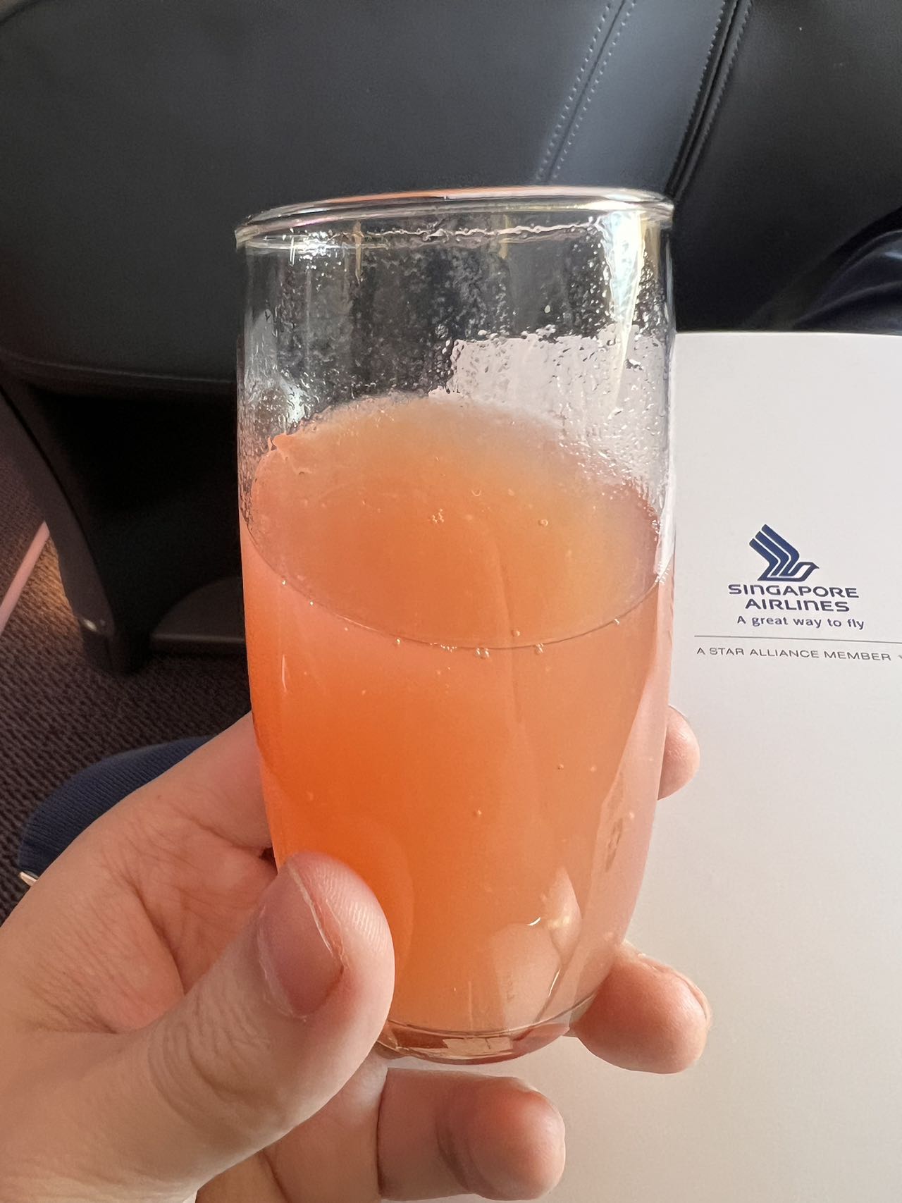 起飞前选择饮料。香槟,橙汁,或者bellini。我选择了bellini的,蜜桃味很好喝,可惜我不会喝酒,只喝了半杯。这个bellini只有起飞前有,属于限量版。