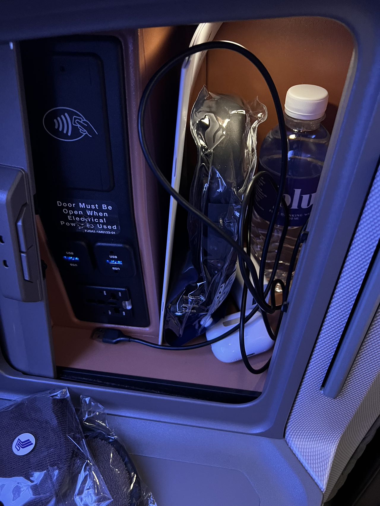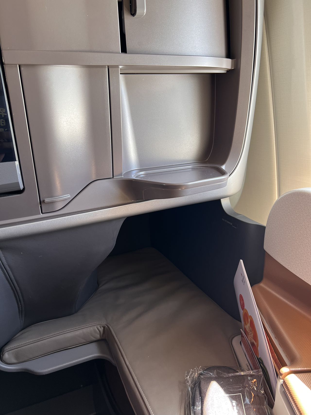 这边这款是不需要空姐帮忙放下来的。中短途几乎没有储物空间,也就是放个鞋,放个手机,耳机,就放不下别的了。