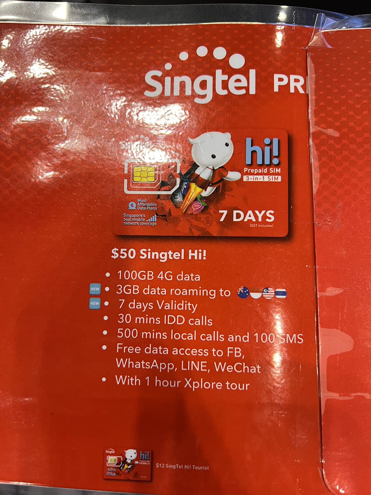 机场50新币的电话卡太坑了啊。强行卖100G给你。。。这种几天以内的行程个人建议了解一下Airalo. 差不多五刀的七天1G套餐其实够用了。eSim安装非常简单
